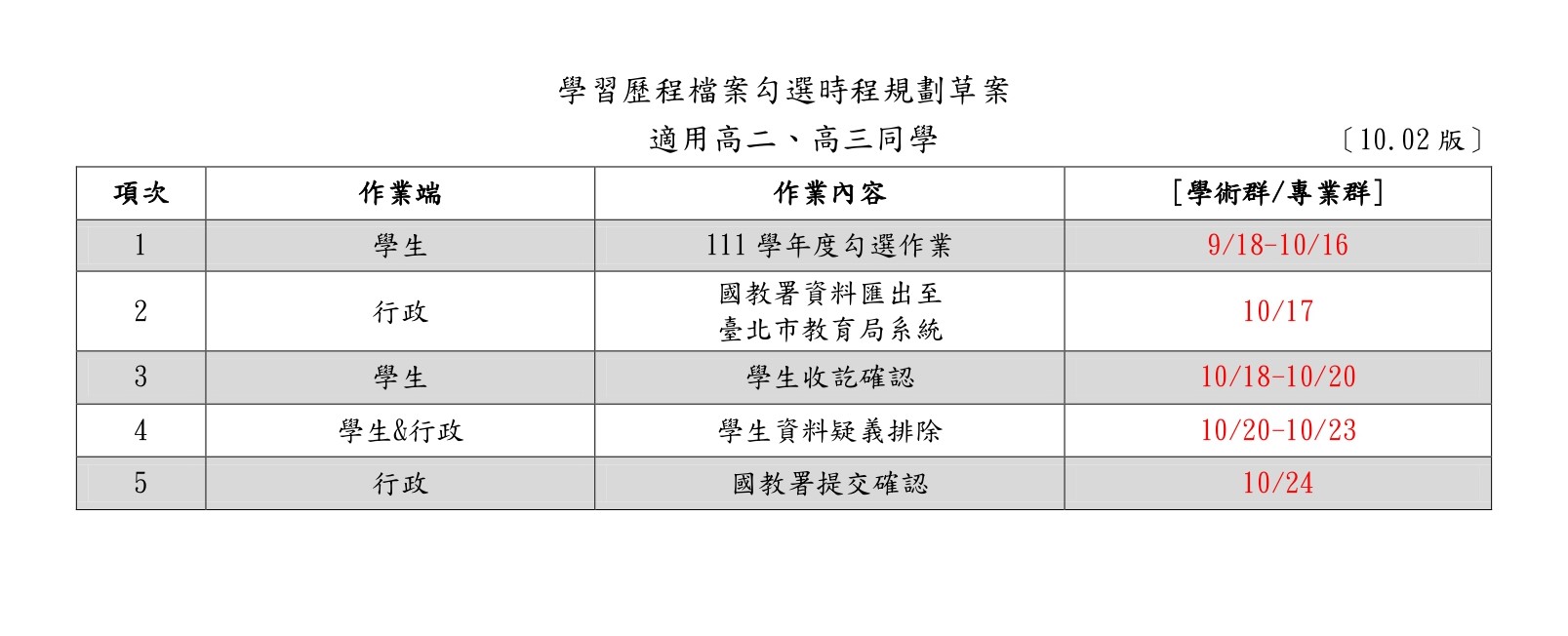 111學年度學習歷程檔案「學生收訖確認」作業截止時間為112/10/20 17:00。