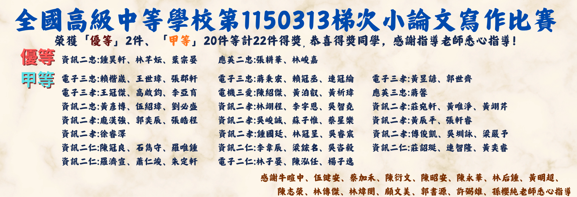 賀!本校學生參加全國高級中等學校第1150313梯次小論文寫作比賽榮獲佳績,榮獲「優等」2件、「甲等」20件,共計22件得獎,恭喜得獎同學,感謝指導老師悉心指導!全體師生仝賀!