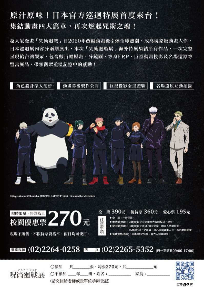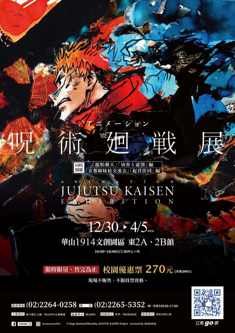 一、為充實國人文化藝術視野、推廣動畫教育、增進國際教育的深度與廣度,聯合數位文創股份有限公司特引進日本超人氣漫畫「咒術迴戰」展覽。「咒術迴戰」自2020年改編動畫後引爆全球熱潮,成為現象級動畫大作,於日本巡迴展內容分兩期展出,本次「咒術迴戰展」海外特展集結所有作品,一次完整呈現給台灣觀眾,期待透過包含數百幅原畫、分鏡圖、 等身FRP、巨型動畫投影及名場還原等豐富展品,一窺圖像授權產業成功背後的密訣!