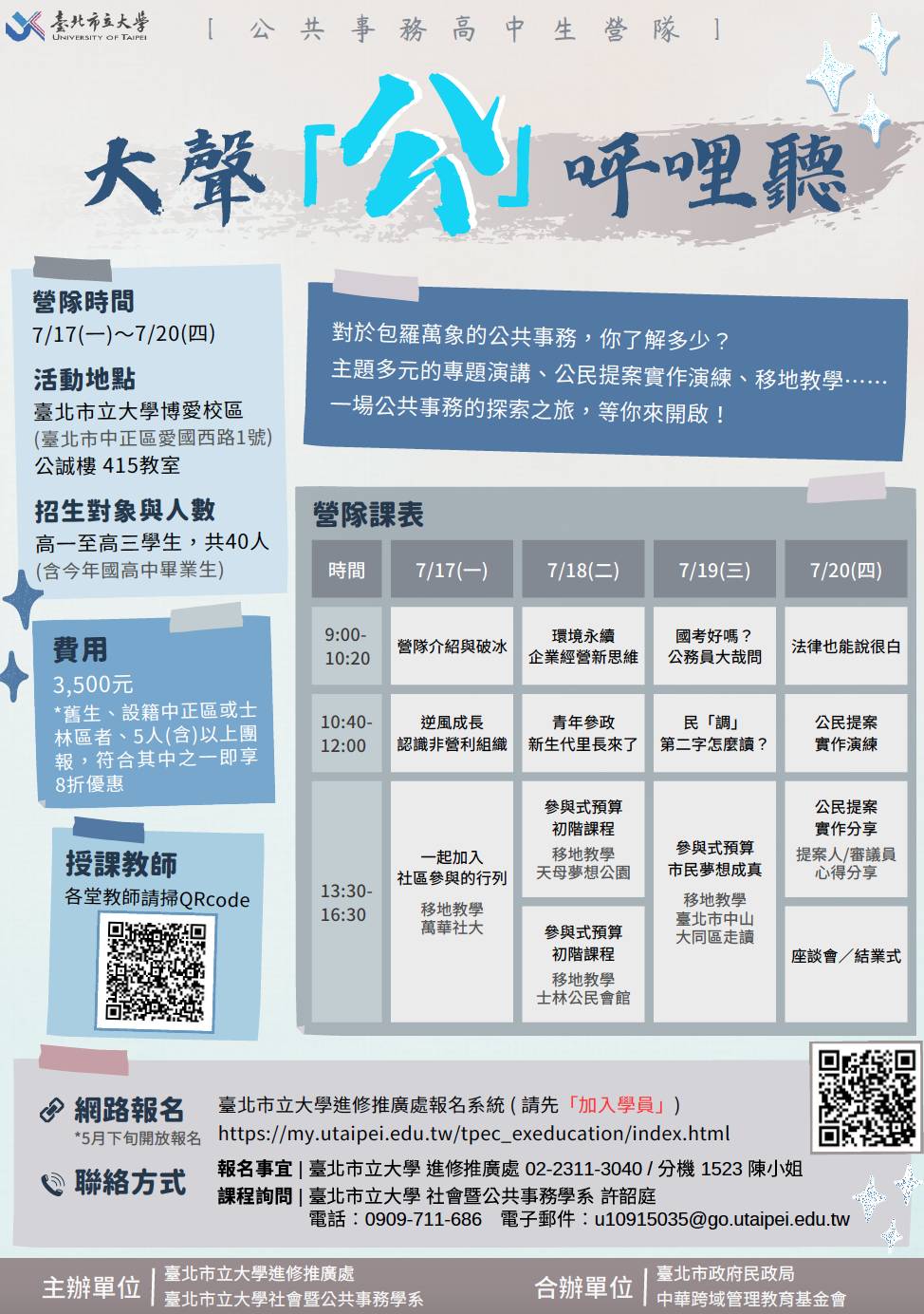 (三)報名資格:升高一至高三學生(含今年國高中畢業生、高中職學生、五專前三年學生),限額40名。