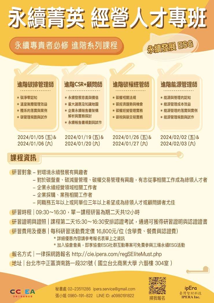 一、課程日期:1.進階碳排管理師培訓:2024/1/5(五) & 1/6(六) (掌握碳盤查與碳足跡ISO14064&14067實務)2.進階CSR+顧問師培訓:2024/1/19(五) & 1/20(六)(掌握永續報告CSR實務)3.進階碳權經管師培訓:2024/1/26(五) & 1/27(六)(掌握碳權稅CBAM&CCA實務)4.進階能源管理師培訓:2024/2/2(五) & 2/3(六)(掌握能源管理系統ISO50001實務)