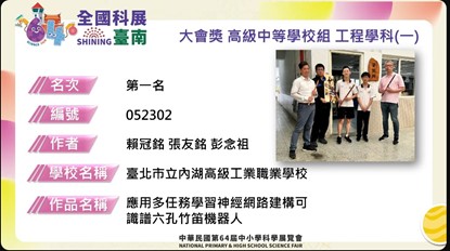 狂賀!本校學生參加第64屆全國中小學科學展覽會大放異彩榮獲工程學科(ㄧ) 大會獎 (第一名)