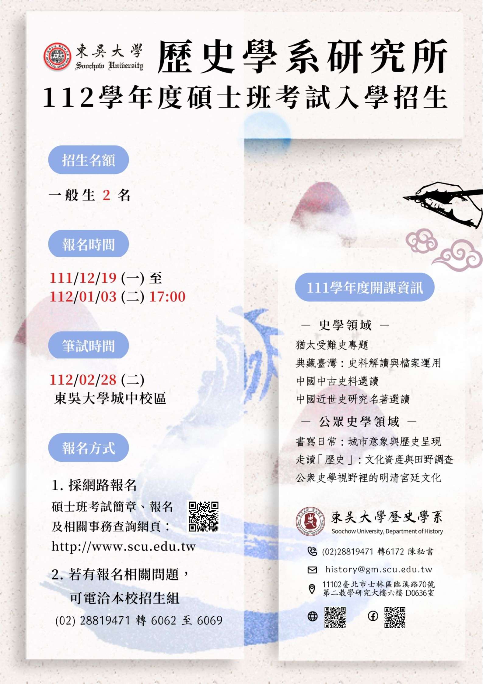 檢送「東吳大學歷史學系112學年度碩士班考試入學」招生海報,敬請協助公告。