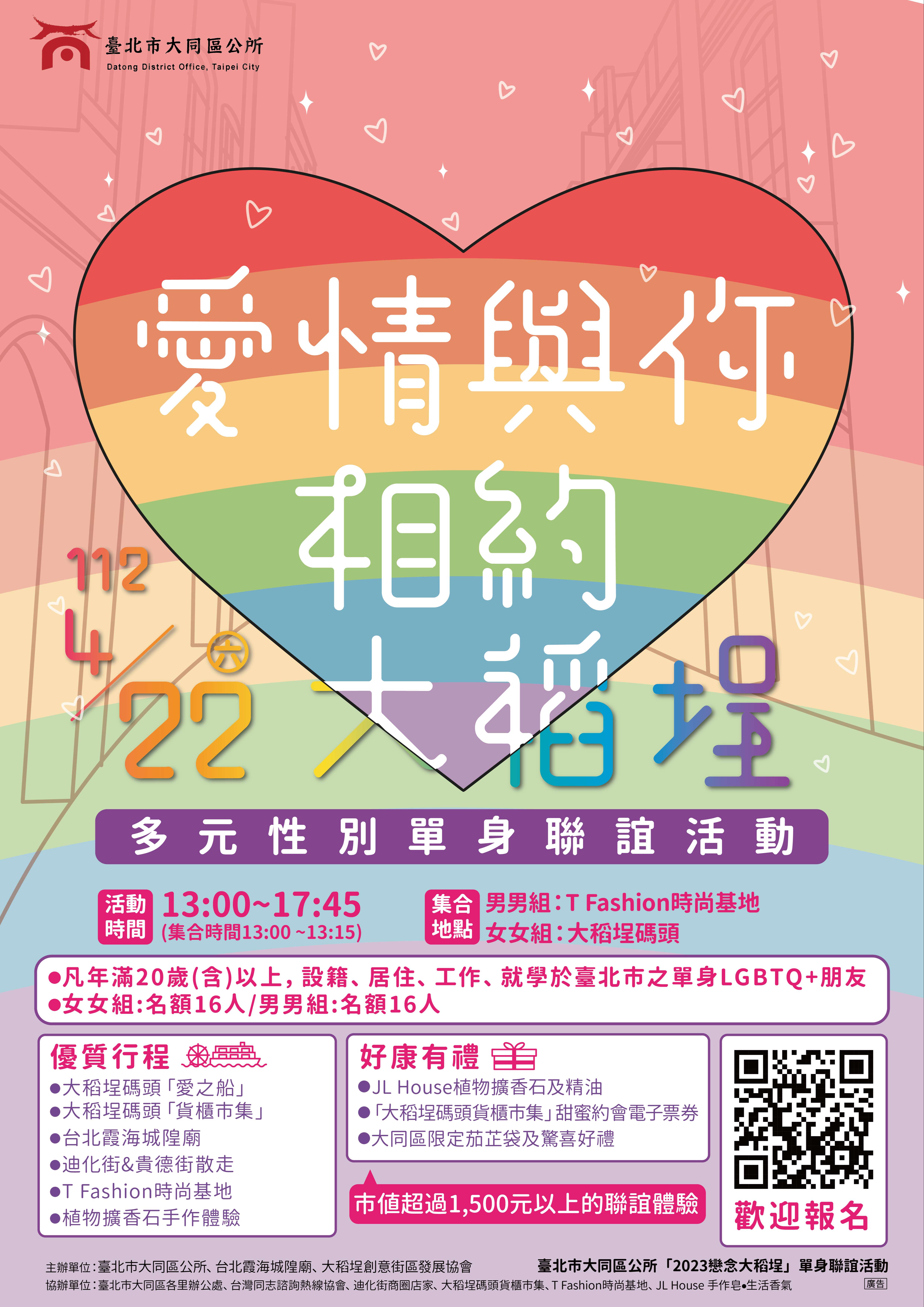 為臺北市大同區公所辦理「2023 戀念大稻埕」多元性別單身聯誼活動,請惠予協助宣傳,請查照。