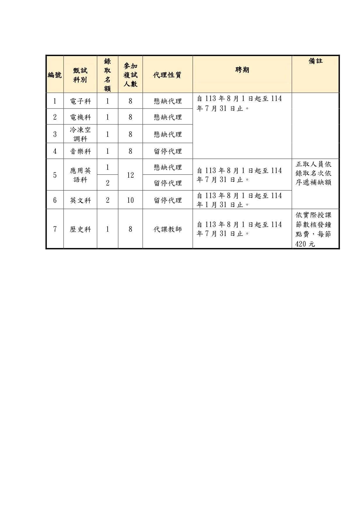 本次甄選尚餘職缺:電子科代理教師(懸缺)1人、電機科代理教師(懸缺)1人、冷凍空調科代理教師(懸缺)1人、音樂科代理教師(留停)1人、應用英語科(懸缺、留停)3人、英文科代理教師(留停)2人、歷史科代課教師1人將進行第2次招考,報名資格、日期等請詳參本校113學年度第1次代理暨代課甄選簡章(第2階段)內容。