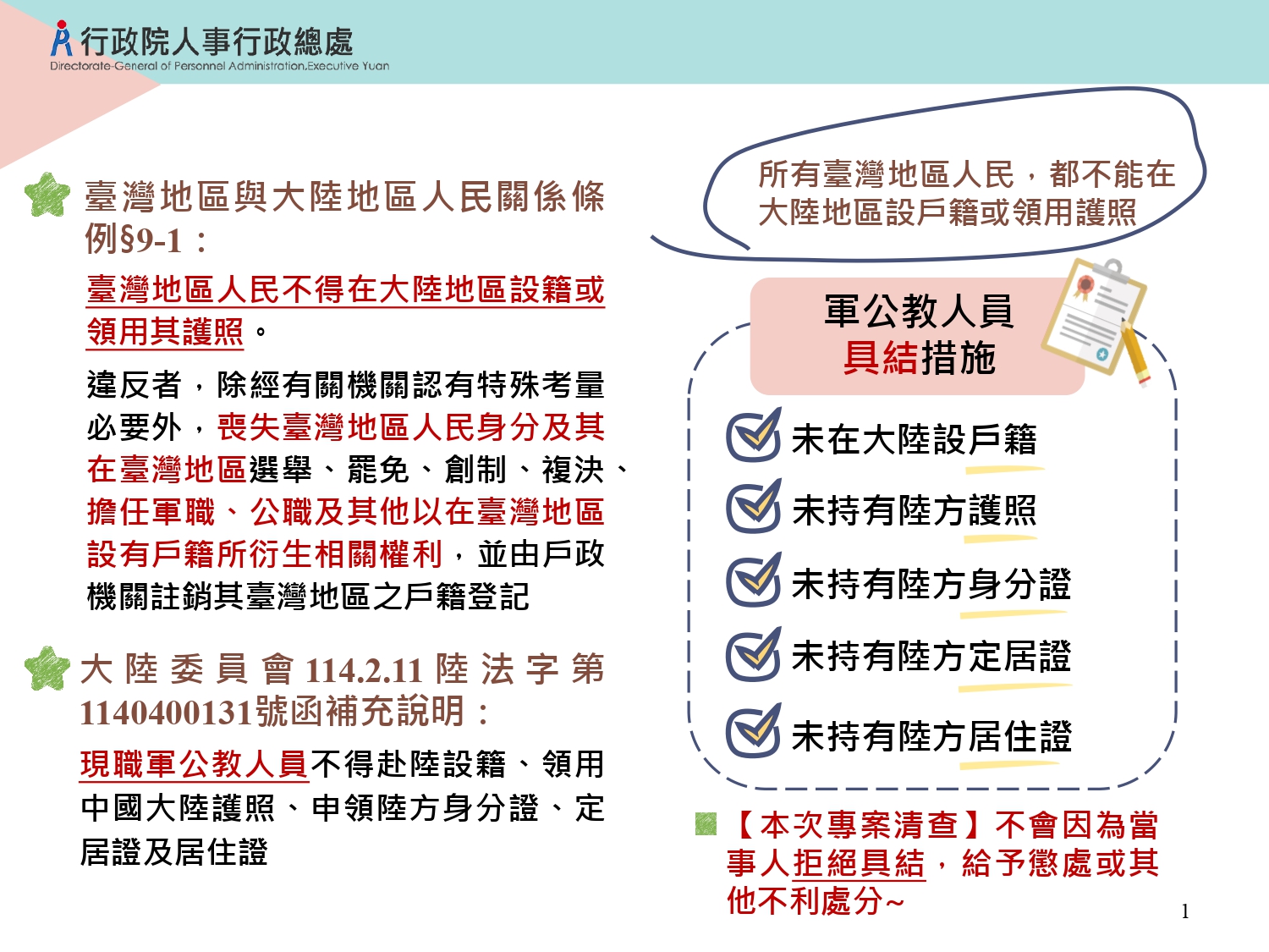 二、查兩岸條例第9條之1立法目的,係規範兩岸「單一戶籍及 單一身分制度」,即我國人不得兼具雙方人員身分,避免 發生權利義務重疊或衝突情事,以維護國家安全及臺灣整 體利益。行為人如自願向中共有關部門申請成為其公民,即負有對中共政權及向其憲法效忠之忠誠義務,同時自願 承擔包含「中華人民共和國國家安全法」、「中華人民共 和國反間諜法」等法律義務,必須向中共國家安全機關、 公安機關和軍事機關提供必要支持與協助之法定責任。兩 岸條例尊重國人對身分之選擇,但不能允許國人兼具兩岸 雙重身分,堅持兩岸身分單一係保護國家安全,確保臺灣 生存發展以及進行兩岸人員往來管理之關鍵核心。容許兼 具兩岸雙重身分將造成身分混同,嚴重衝擊兩岸人員往來 互動與社會運作秩序,其風險我方無法承擔。