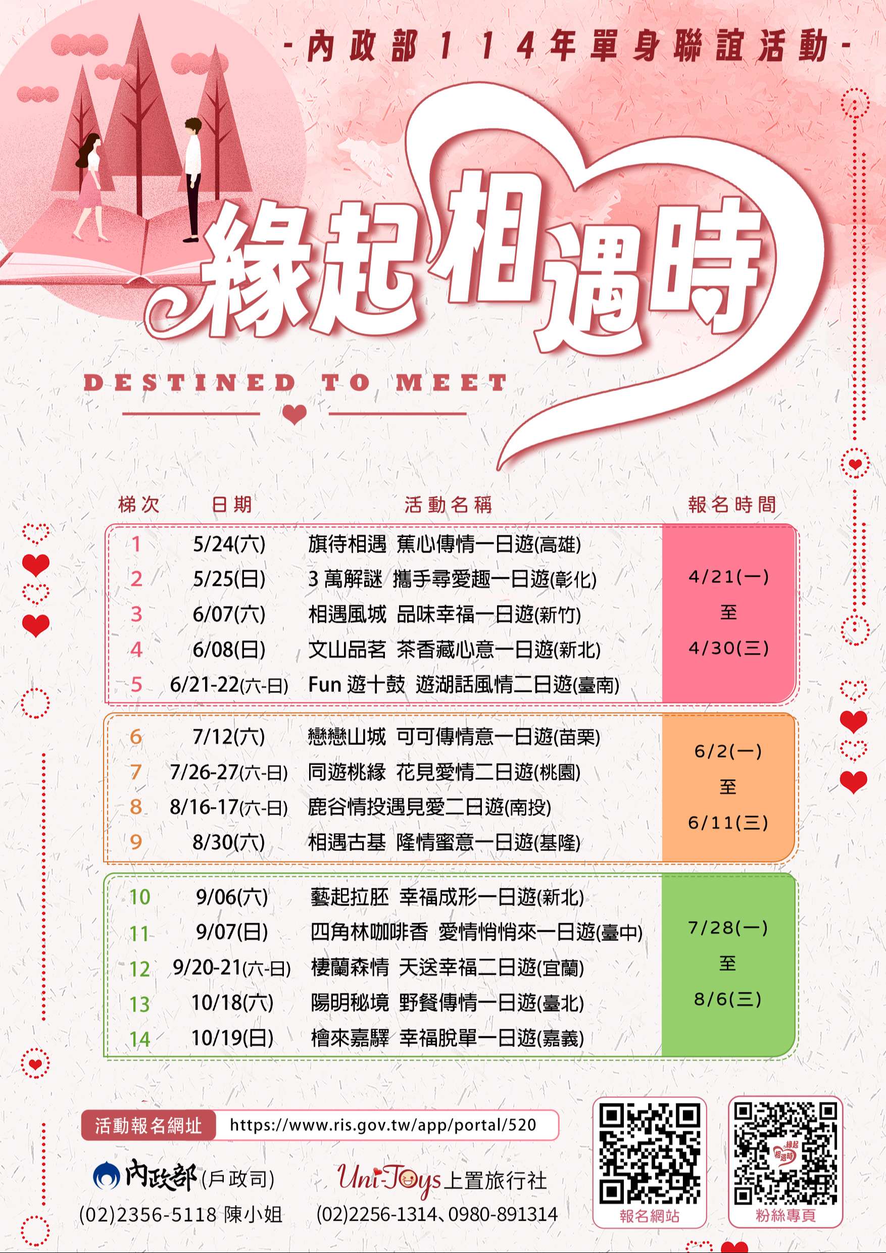 為提升國人婚姻機會,內政部規劃於114年5月至10月辦理14梯次單身聯誼活動;第1至第5梯次活動於4月21日12時起至4月30日23時59分止受理報名,活動詳情及報名方式請參閱活動網頁(https://www.ris.gov.tw/app/portal/520)
