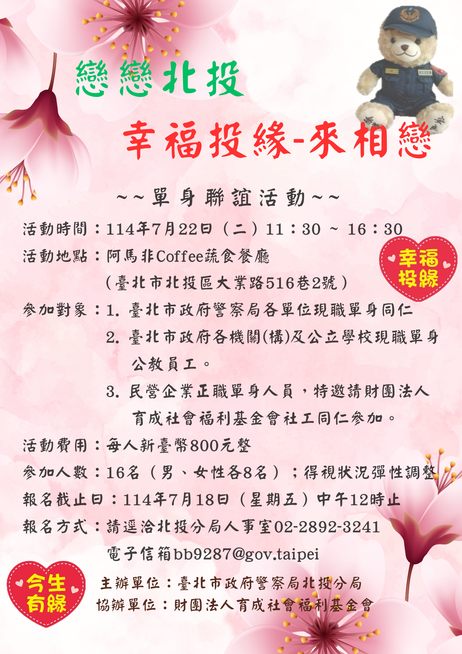 (三)參加對象: 1、臺北市政府警察局各單位現職單身同仁。 2、臺北市政府各機關(構)及公立學校現職單身公教員 工。3、民營企業正職單身人員,特邀請財團法人育成社會福 利基金會社工同仁參加。