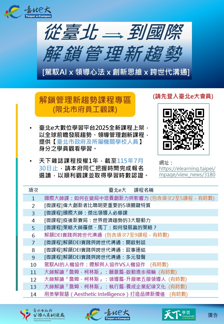 一、為持續引領本府同仁掌握國際趨勢及前瞻觀點新知,臺北e 大數位學習平臺2025全新課程上架,以全球前瞻發展趨勢、領導管理創新課程,提供「臺北市政府及所屬機關學校人員」身分之學員觀看學習。
