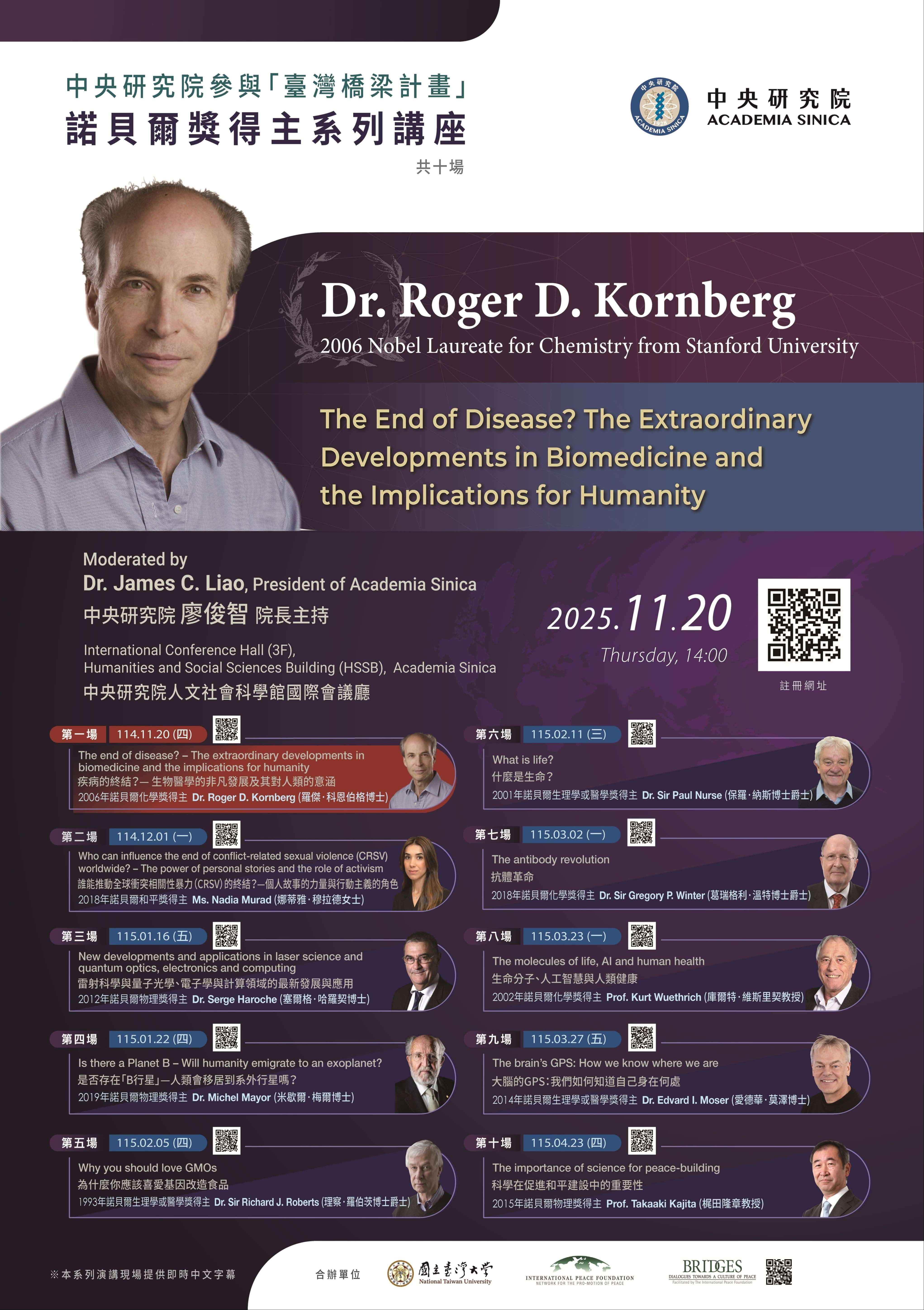 一、「臺灣橋梁計畫」自本(114)年11月起至115年4月,共將 邀請 31 位諾貝爾獎得主訪問本院及全臺十餘所大學,相 關資訊請參閱網站:https://www.peace-bridges.net/。