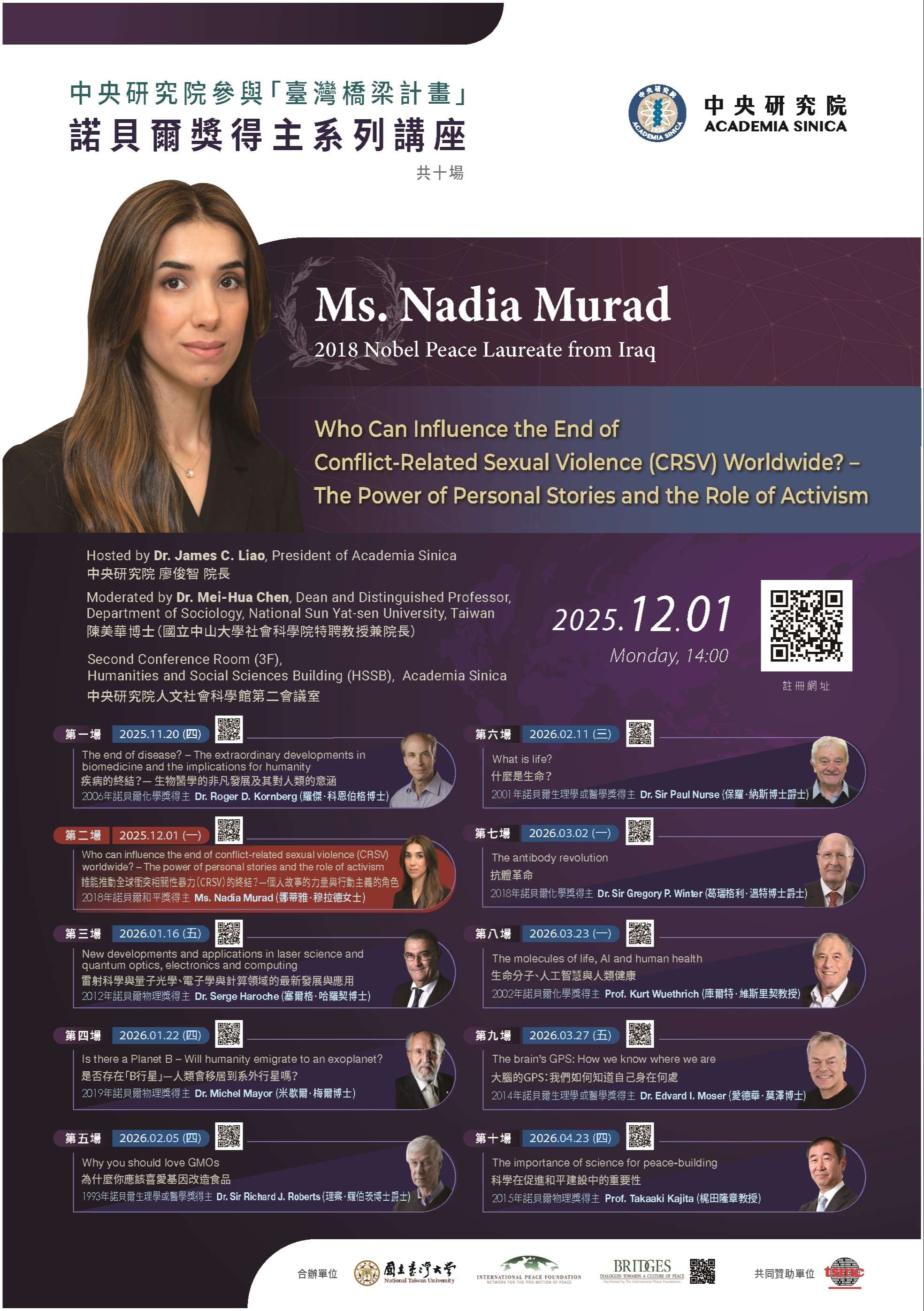 一、「臺灣橋梁計畫」自本(114)年11月起至115年4月,共將 邀請 31 位諾貝爾獎得主訪問本院及全臺十餘所大學,相 關資訊請參閱網站:https://www.peace-bridges.net/。