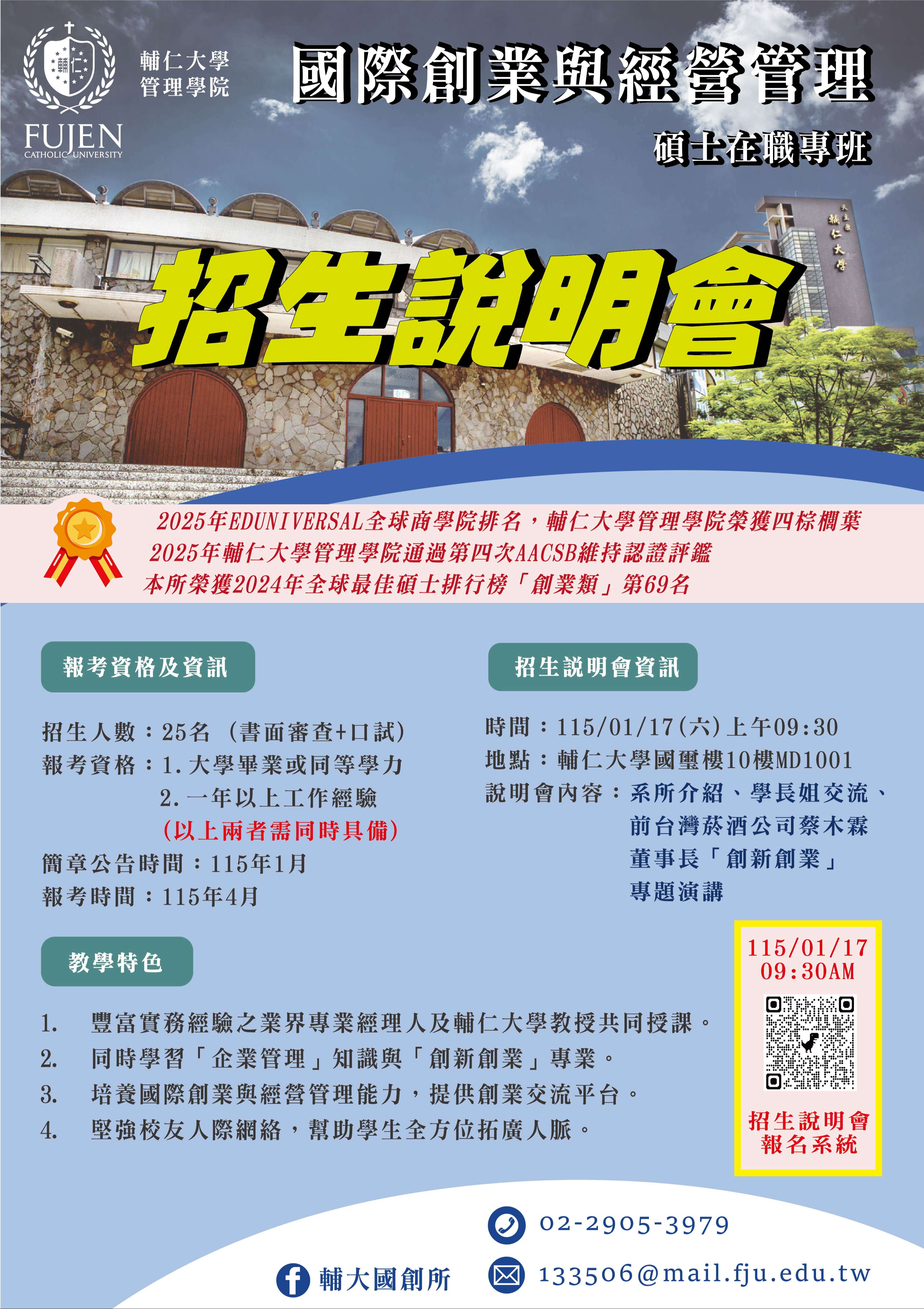 三、 本碩士在職專班115學年度招生說明會相關資訊如 下: 時間:2026/01/17(六)上午09: 30點:輔仁大學國璽樓10樓 MD1001 報名網 址:https://forms.gle /971j19RbLN8D3UPu6 四、 聯絡資訊:(02)2905-3979,133506@mail.fju.edu. tw。 官方網站:http://gemba.fju.edu.tw /。 臉書專頁: https://www.facebook.com/gembagroup/。