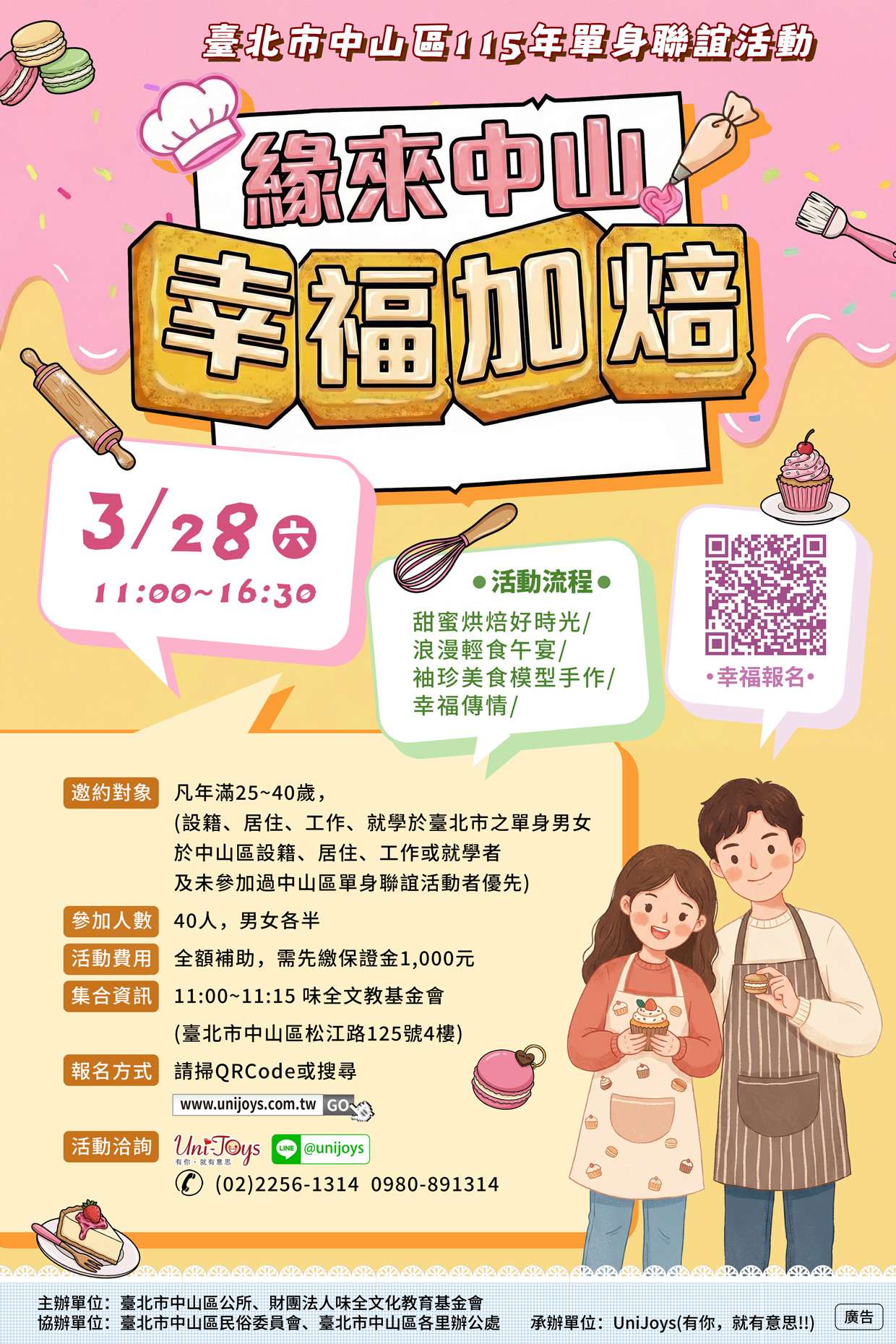 二、請貴單位惠予協助於所屬網站宣傳,文稿內容如下:「臺 北市中山區公所『緣來中山 幸福加焙』單身聯誼活動,將 於115年3月28日(星期六)11時至16時30分假味全文教基 金會舉辦,活動名額為男、女各20人,共40人,歡迎年齡 25歲以上至40歲於本市設籍、居住、工作或就學之單身者 踴躍報名參加(於中山區設籍、居住、工作或就學者及未參加過中山區單身聯誼活動者得優先),活動詳情請參閱 區公所官網(https://zsdo. gov. taipei/)或電洽(02) 25031369分機593鍾小姐。」