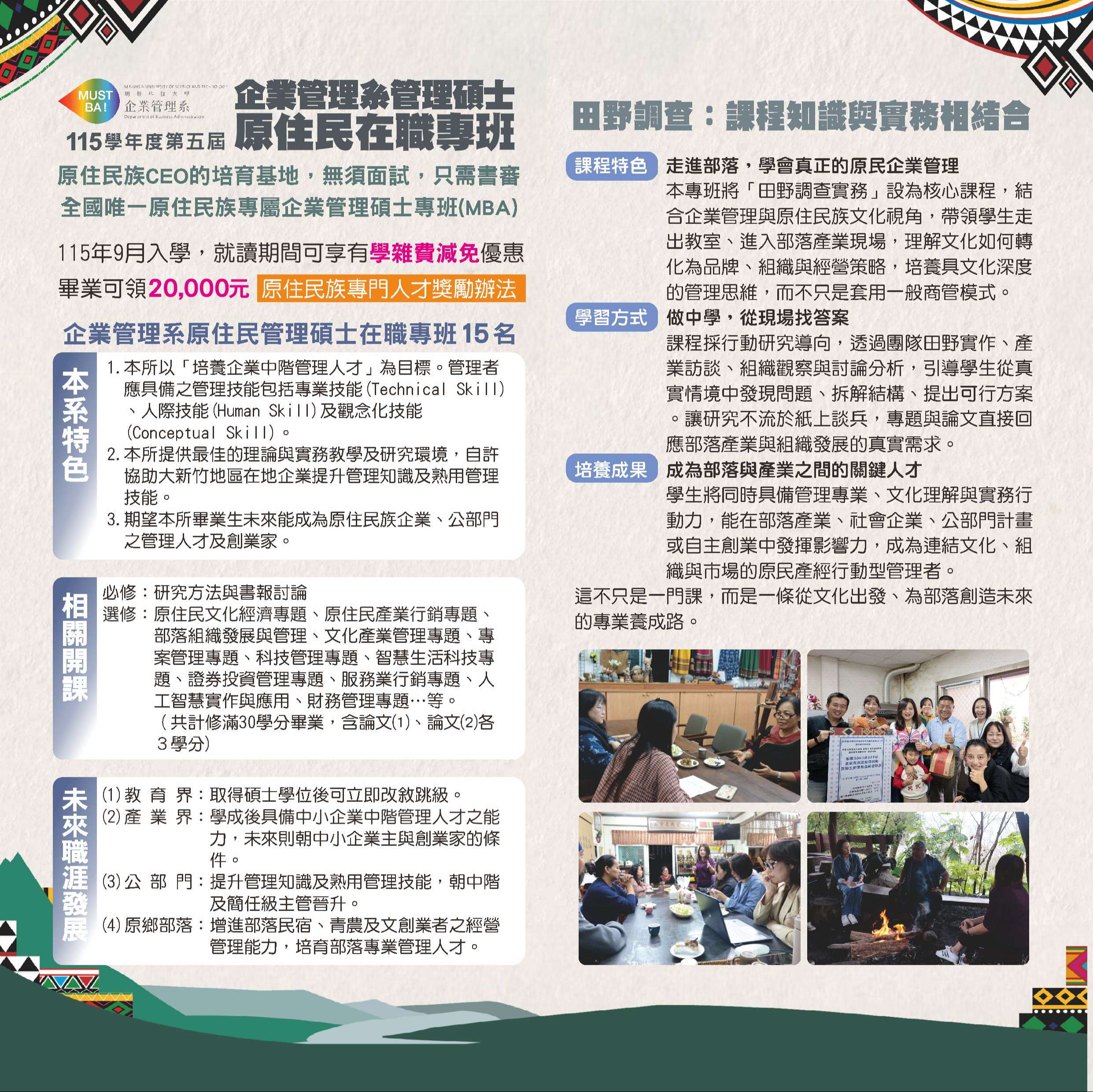 (三)期望旨揭專班畢業生末來能成為原住民族企業、公部門 之管理人才及創業家。 竭誠歡迎對原住民族相關議題有興趣之學生報考。