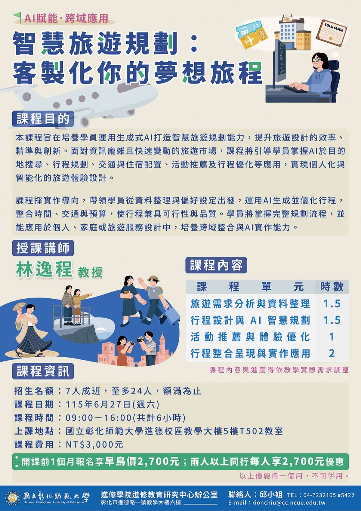 (一)課程特色:課程採實作導向,運用AI生成並優化個人化 旅遊行程,整合時間、交通、預算,培養完整規劃能 力,並應用於個人或企業專案。