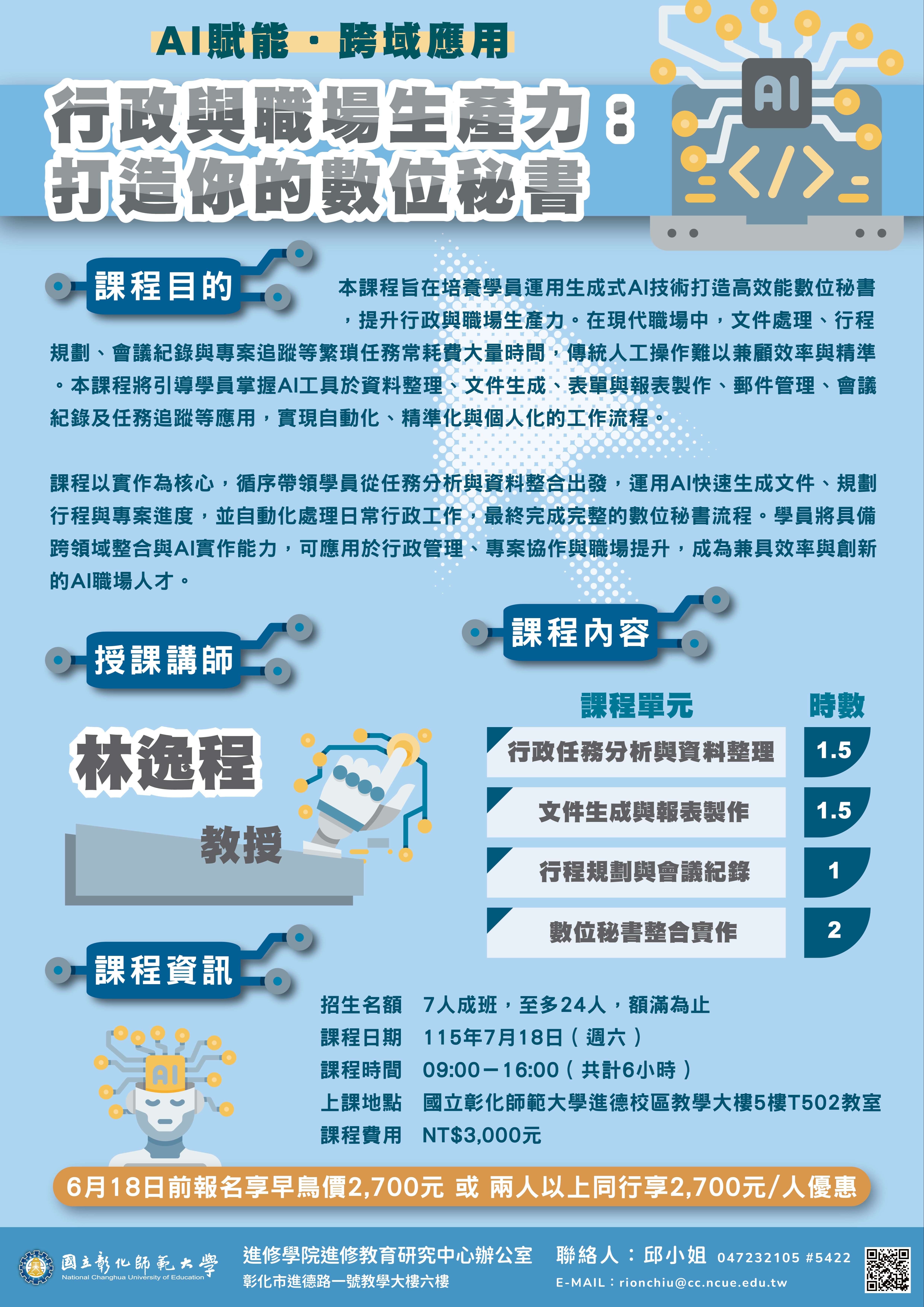 三、「【AI賦能.跨域應用】 行政與職場生產力:打造你的數 位秘書」