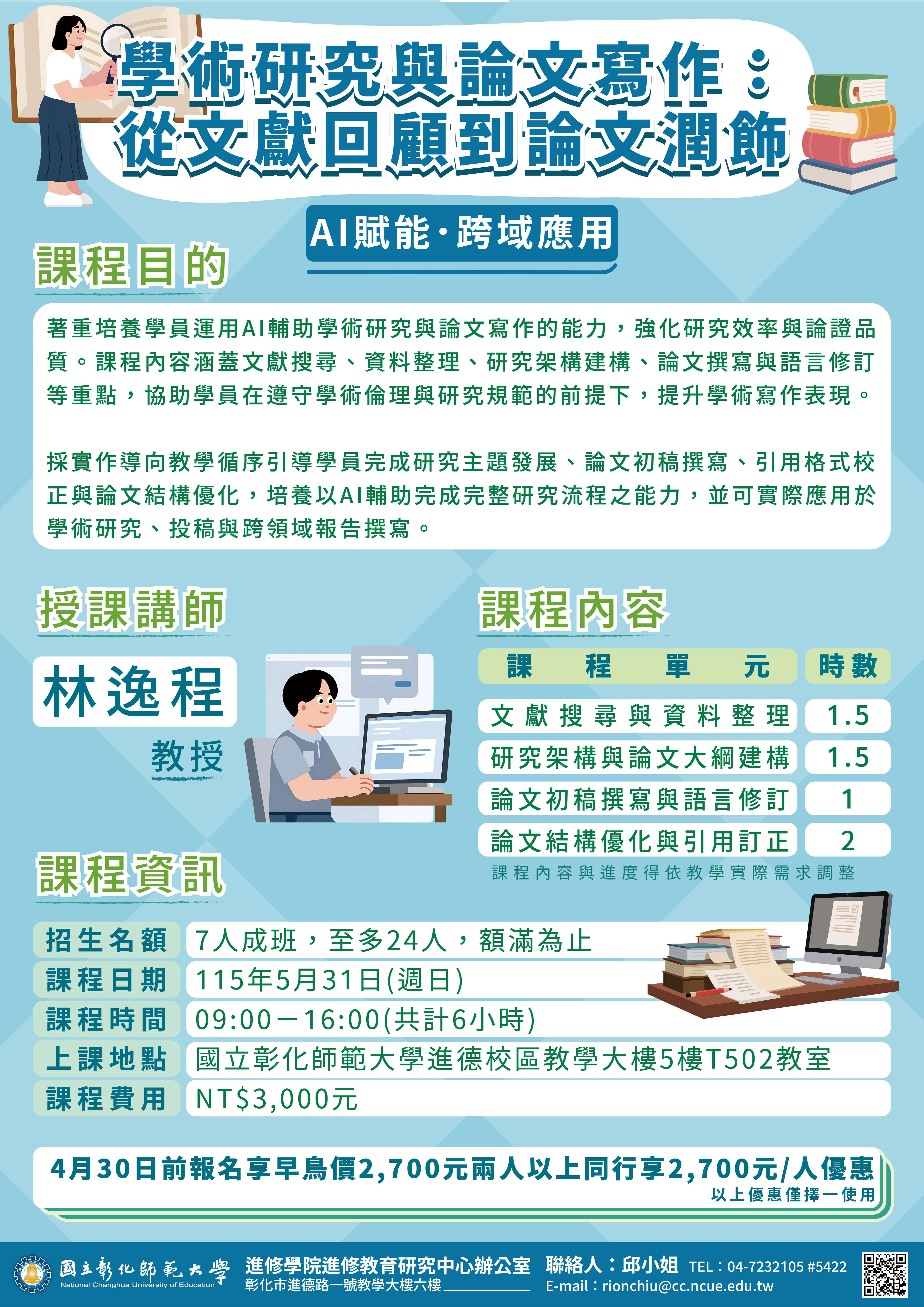 (三)課程費用:3,000元,開課前1個月報名享早鳥價2,700 元;兩人以上同行每人享2,700元優惠。以上優惠擇一使用,不可併用。【AI賦能.跨域應用】學術研究與論文 寫作舊生另享優惠2,500元。