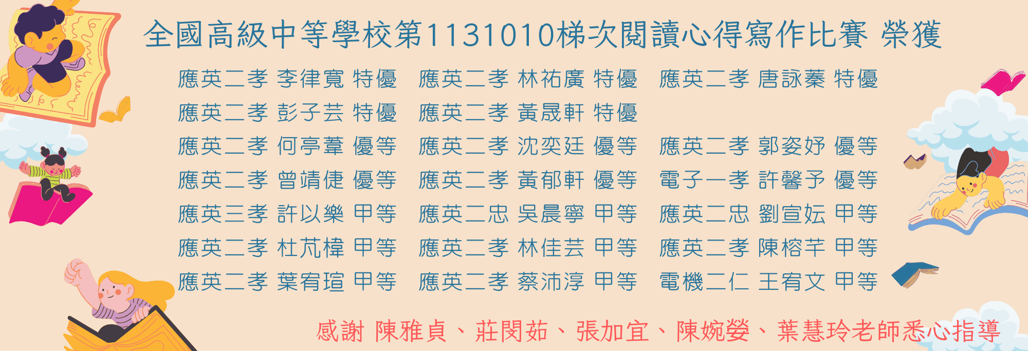 賀!本校學生參加全國高級中等學校第1131010梯次閱讀心得寫作比賽榮獲佳績,共計20件得獎,特優5件、優等6件、甲等9件,