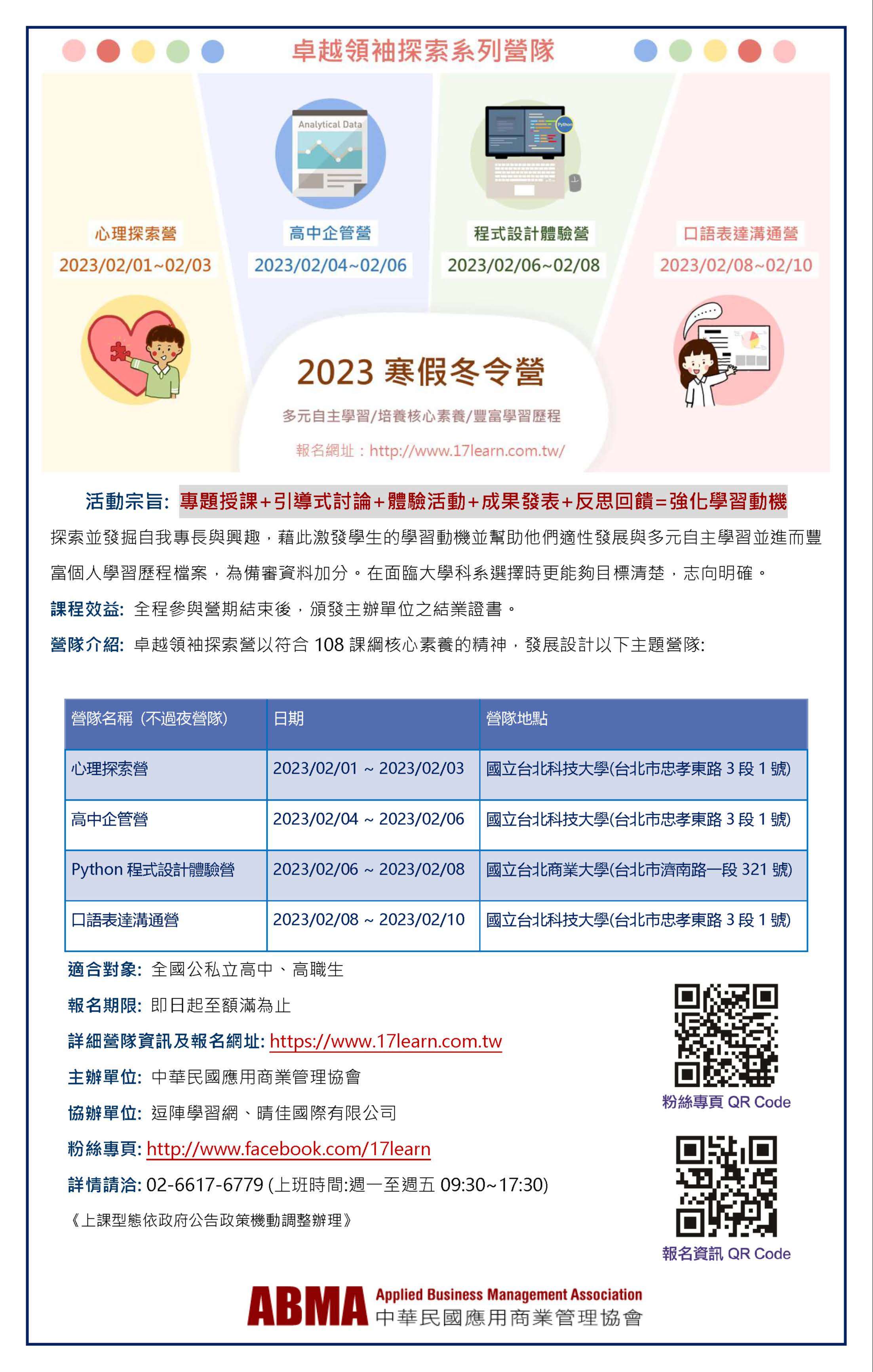 二、營隊名稱:「心理探索營」、「高中企管營」、「口語表達溝通營」、「Python程式設計體驗營」