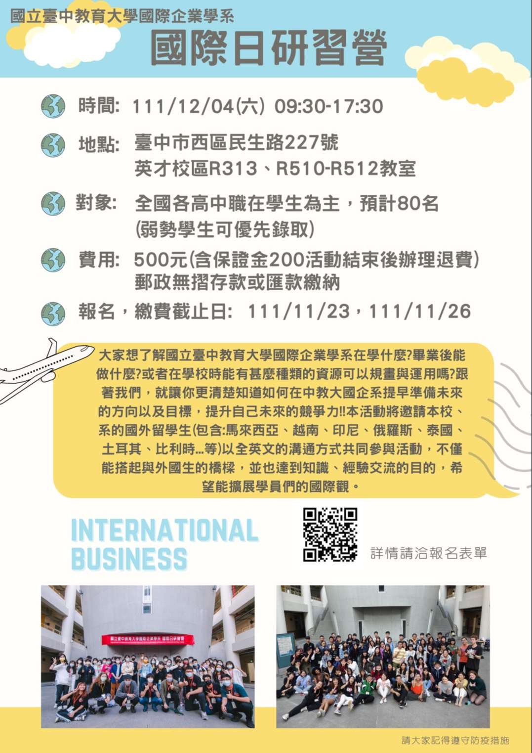 (一)直接在附件之國際日研習營海報→掃描QR code 或至本系網頁http://ib.ntcu.edu.tw/→最新公告→國際日研習營公告下方網址填寫網路報名表單。