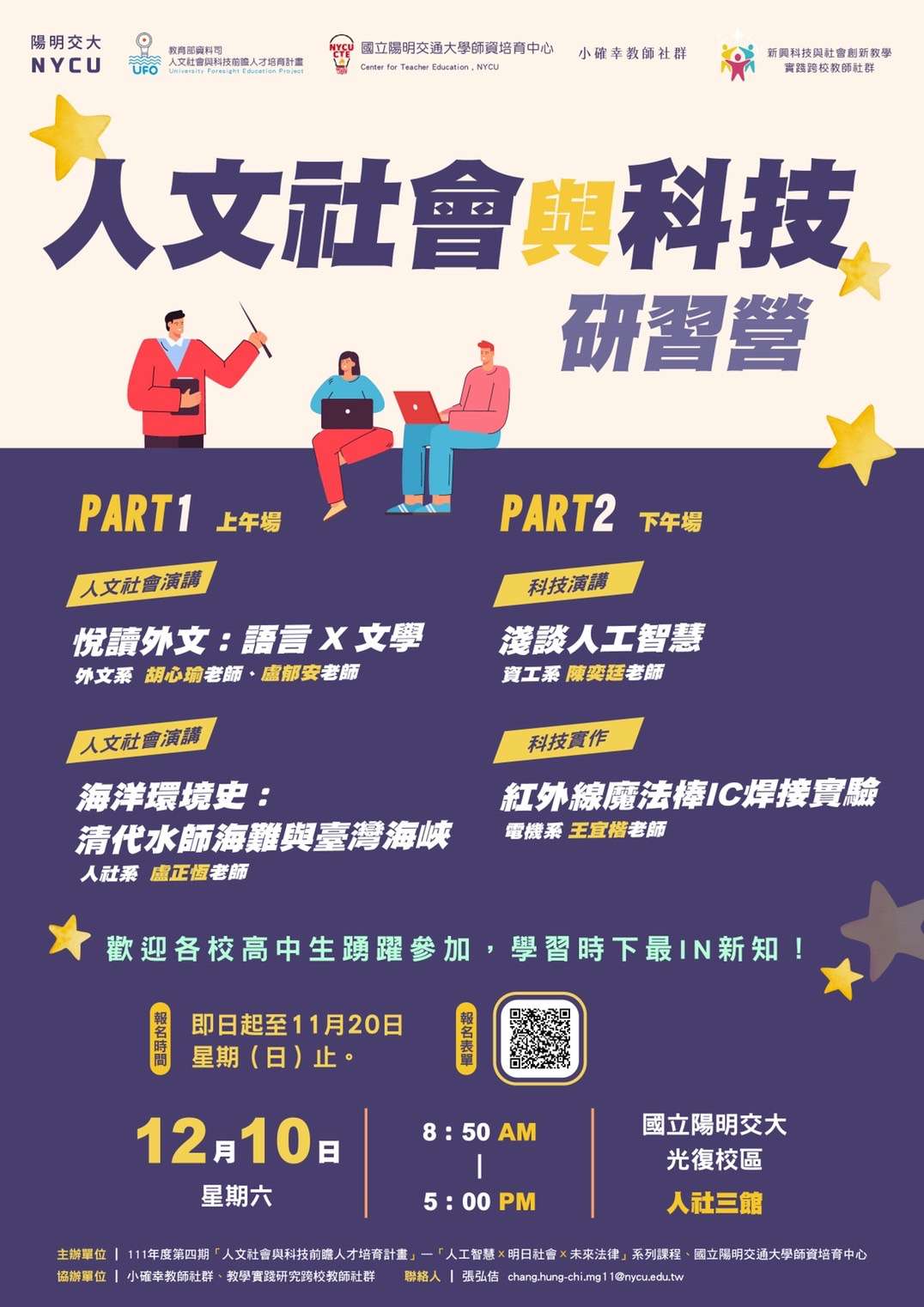 (四)研習營相關問題請洽張弘佶先生,信箱:chang.hungchi.mg11@nycu.edu.tw,手機:0963-518-070。