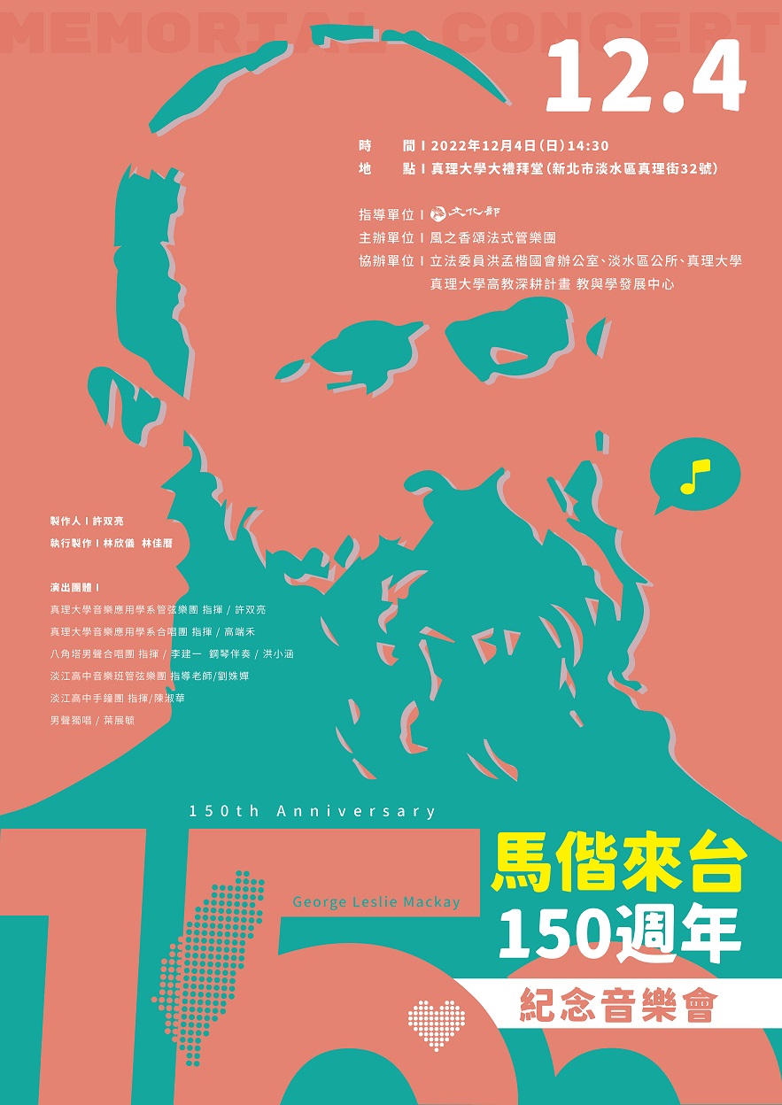 一、今年適逢馬偕博士(George Leslie Mackay)來臺宣教150週 年,他在宣教、醫療和教育的領域皆有卓越而影響深遠的貢獻,為了紀念馬偕,由真理大學協辦策劃本場音樂會, 講述馬偕博士在臺灣「寧願燒盡,不願朽壞」的故事。