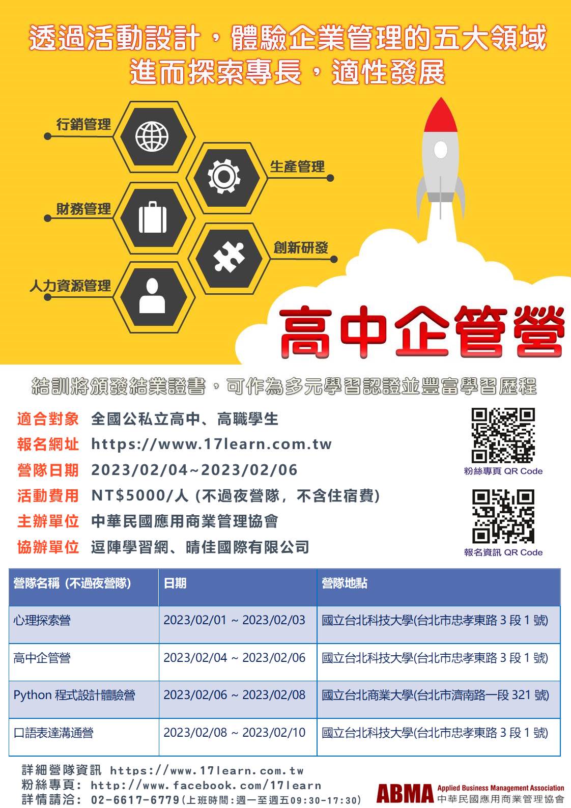 二、營隊宗旨:培養有志於往企業管理領域發展的高中/高職生及早具備企業管理六大基礎核心能力: 問題分析力、人際溝通力、思考決策力、團隊合作力、創新創意力、規劃執行力。將真實的商業經營情境透過互動學習、體驗活動、 分享回饋、引導討論的模式,使學員體驗企業管理的五大領域,進而探索專長,適性發展營隊。