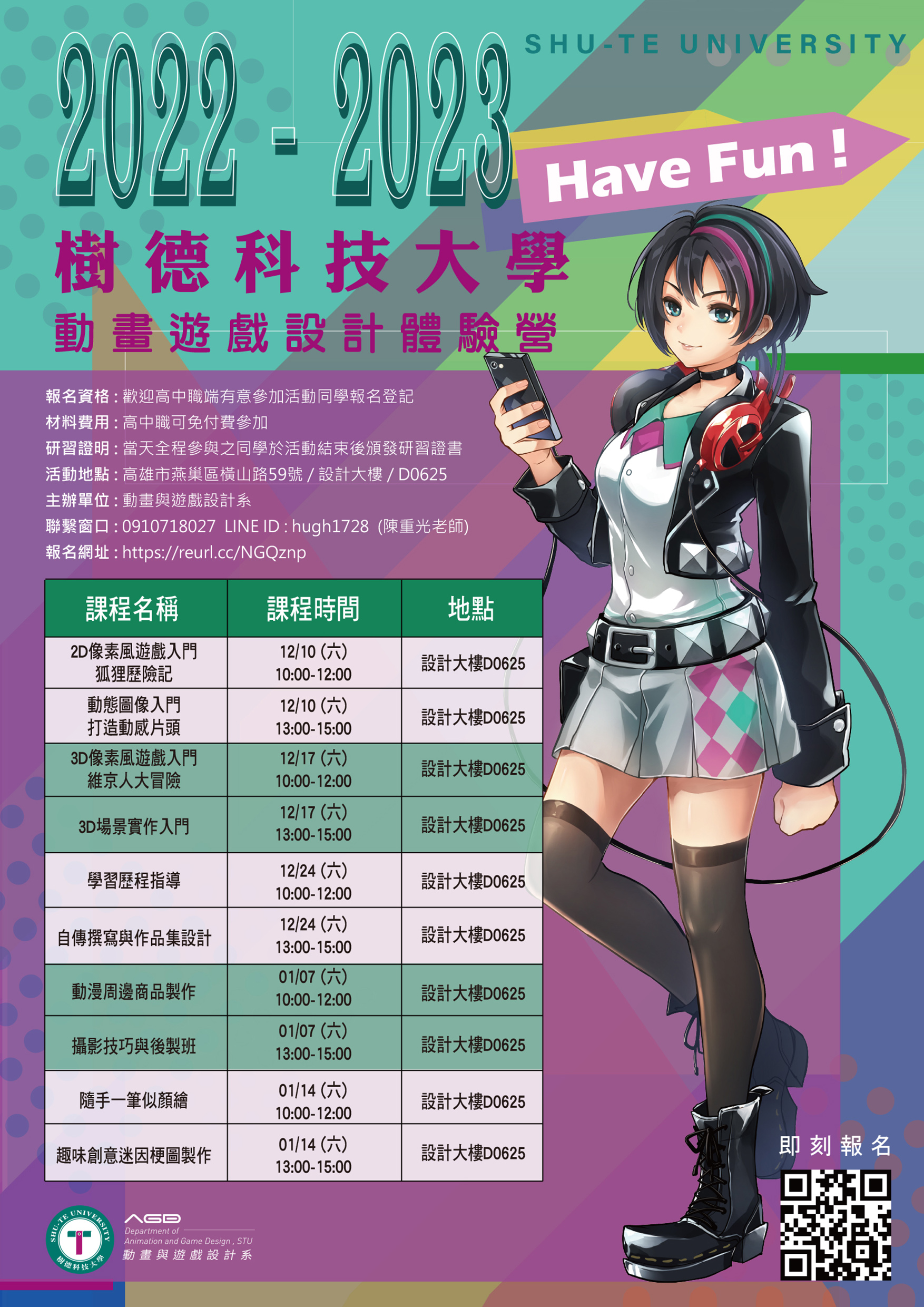 一、歡迎高中職對動畫、遊戲有興趣的同學網路報名參加,相關研習課程如附件海報。