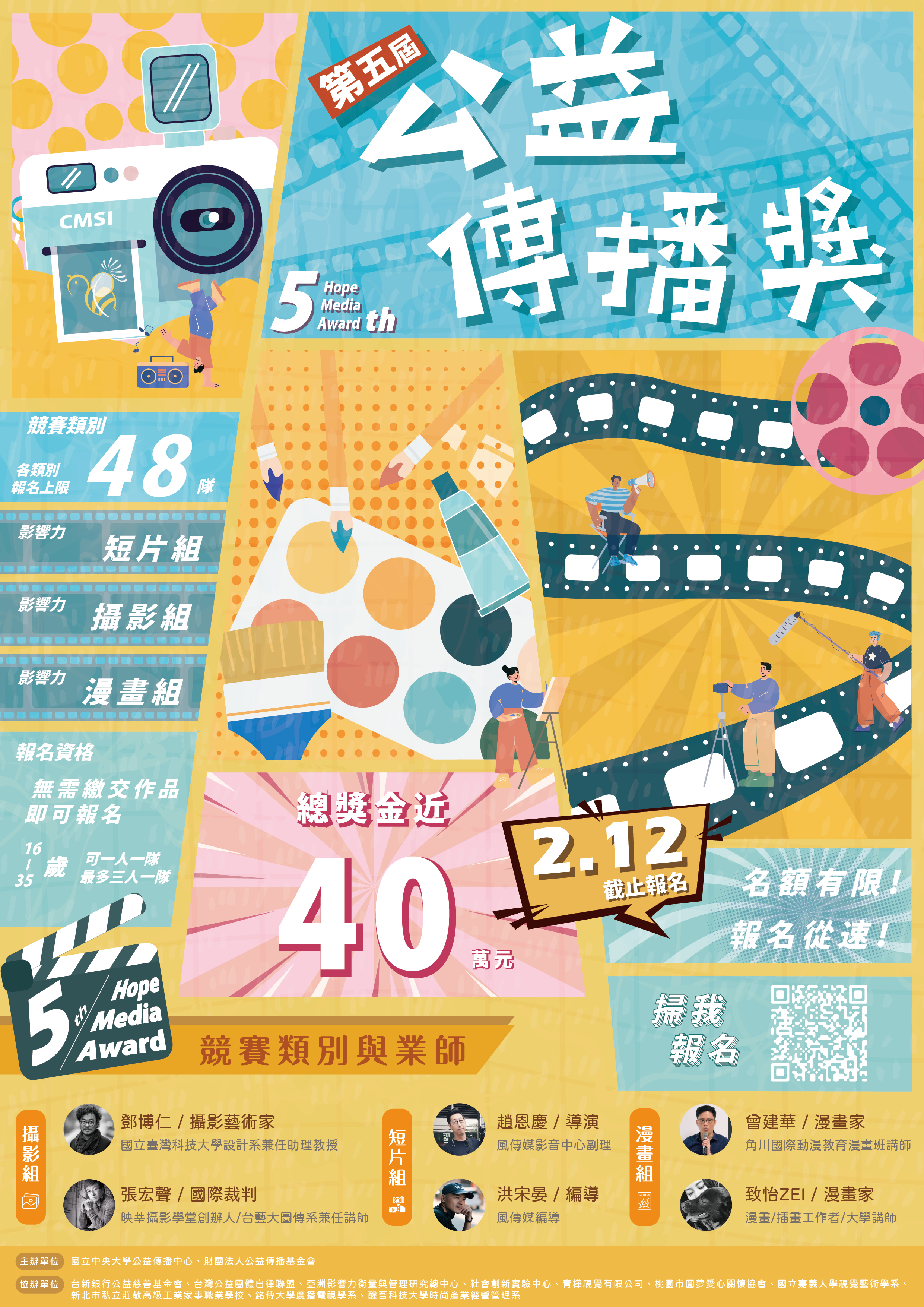 五、競賽詳細資訊請參附件簡章或至公益傳播中心官網 (https://cmsi.mgt.ncu.edu.tw/hopemedia_award/)查詢。