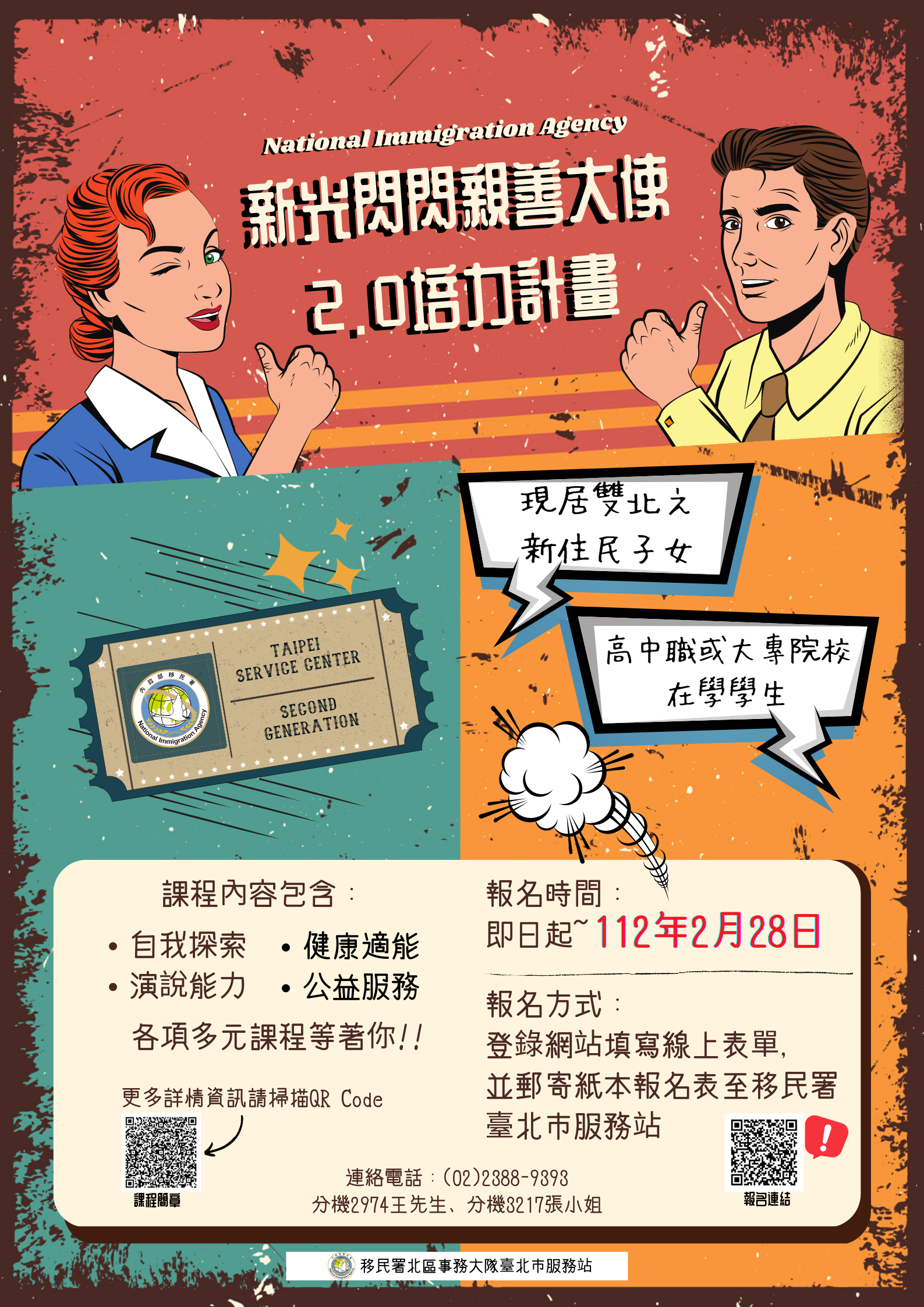 二、旨揭計畫係為徵選現就讀本市高中職及大專院校之新住民二代學生,成立新光閃閃親善大使團並安排免費培訓課程,報名期間自即日起至112年2月28日(星期二)止,報名採線上及紙本同步寄送方式,詳情請瀏覽臺北市服務站官網【課程訊息】(網址:https://servicestation.immigration.gov.tw/1469/1518/3892/3936/333389/)。