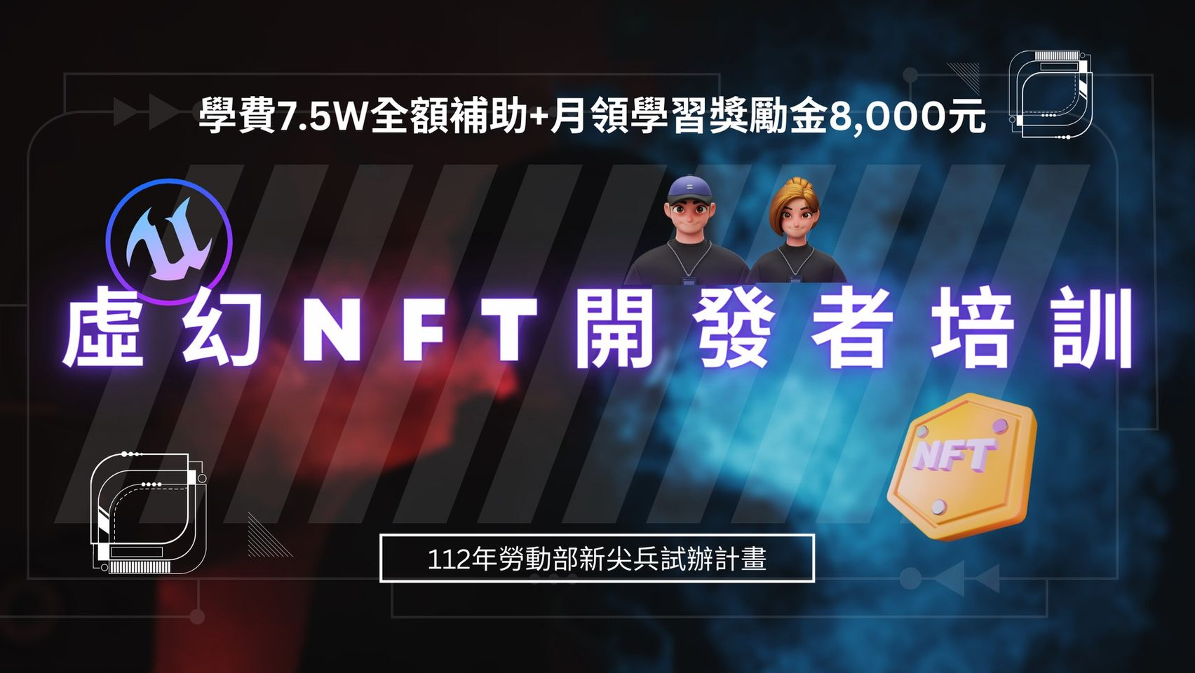 一、臺北科技大學進修部配合勞動部透過職業訓練實施,強化青年知識 與技能,培育國家重點創新產業人才,聘請數位產業講師 傳授產業實作課程,開辦業界講師授課,期許能縮短學用 落差,促進青年就業,預計於112年3月15日開辦「虛幻NFT 開發者培訓班」、112年4月8日「Layout工程師人才培訓班」和112年4月12日開辧「數位行銷及廣告實作人才培訓 班(第7梯次)」,相關課程文宣資料如附件。