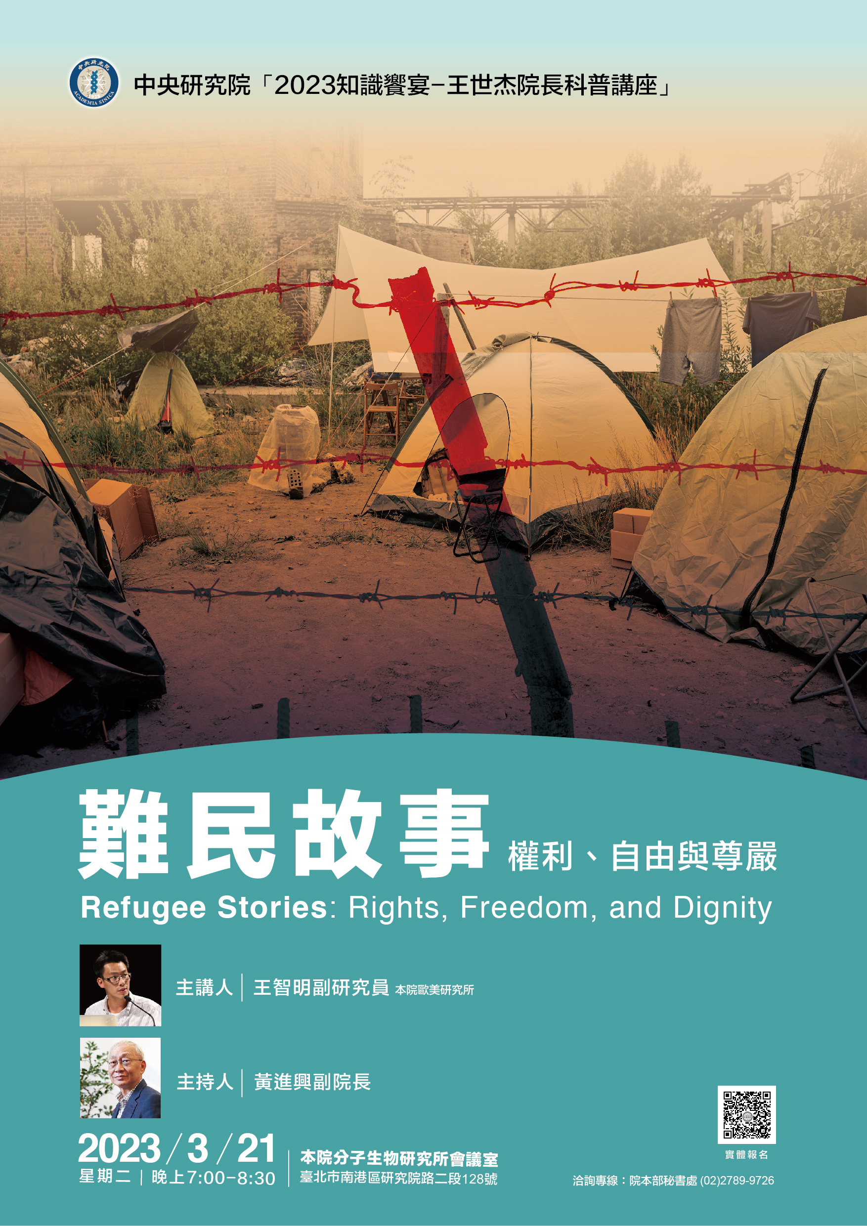 一、中央研究院為紀念王故院長世杰先生132歲冥誕,特邀請歐美研究所王智明副研究員主講:「難民故事:權利、自由與 尊嚴」(活動海報如附件)。時間:112年3月21日晚間7時至8時30分,地點:中央研究院分子生物研究所會議室。