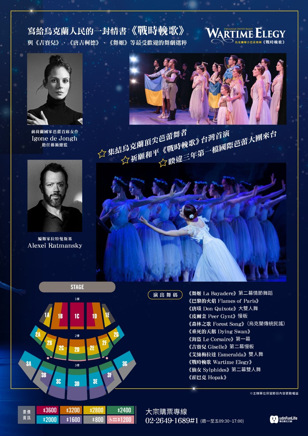 (三)表演介紹:烏克蘭聯合芭蕾舞團(United Ukrainian Ballet)集結一群烏克蘭頂尖芭蕾舞者,他們來自於烏克蘭各地劇院與舞團,因烏俄戰爭而流離失所,最後落腳荷蘭海牙,在此重拾舞鞋,恢復日常的訓練,組成一 支職業舞團,在此作為烏克蘭芭蕾舞者的戰時庇護所。 2022年烏克蘭聯合芭蕾舞團陸續巡演英國、澳洲、新加坡、美國等地,所到之處票券銷售一空,感動無數觀眾,讓世人見證藝術撫慰人心的神奇力量。本次舞團將帶來《戰時輓歌》、《吉賽兒》、《唐吉軻德》、《舞姬》等最受歡迎的舞劇選粹。《戰時輓歌Wartime Elegy》是當代最重要的編舞家之一拉特曼斯基 (Alexei Ratmansky)在烏俄戰爭爆發後的全新創作, 但並未充滿政治訊息,相反地,他採用了烏克蘭當代最知名作曲家西爾維斯特洛夫(Valentin Silvestrov)的音樂,加上烏克蘭傳統歌曲,是拉特曼斯基寫給烏克蘭人民的一封情書,向他們堅韌不拔的精神致敬,並祈禱未來的和平。其他精采節目包括《舞姬La Bayadere》充滿動感與異國風情的第二幕;以雙手關節展現不可思議靈活度與生命力的《垂死的天鵝The Dying Swan》;挑 戰男女舞者技巧極限的《海盜 Le Corsaire》第一幕; 以及《唐吉軻德Don Quixote》的大雙人舞等,其32鞭轉的難度完全不遜於黑天鵝在《天鵝湖》的高潮。此外, 舞團更特邀世界其他頂尖舞團的烏克蘭舞星,包括前馬林斯基首席Anastasia Matvienko與Denis Matvienko, 以及英國國家芭蕾的Katya Khaniukova等人加入客席陣容,為台灣民眾帶來一場最精采的芭蕾盛宴,希望以藝術感動人心,為這個紛擾的世界帶來光明與希望。