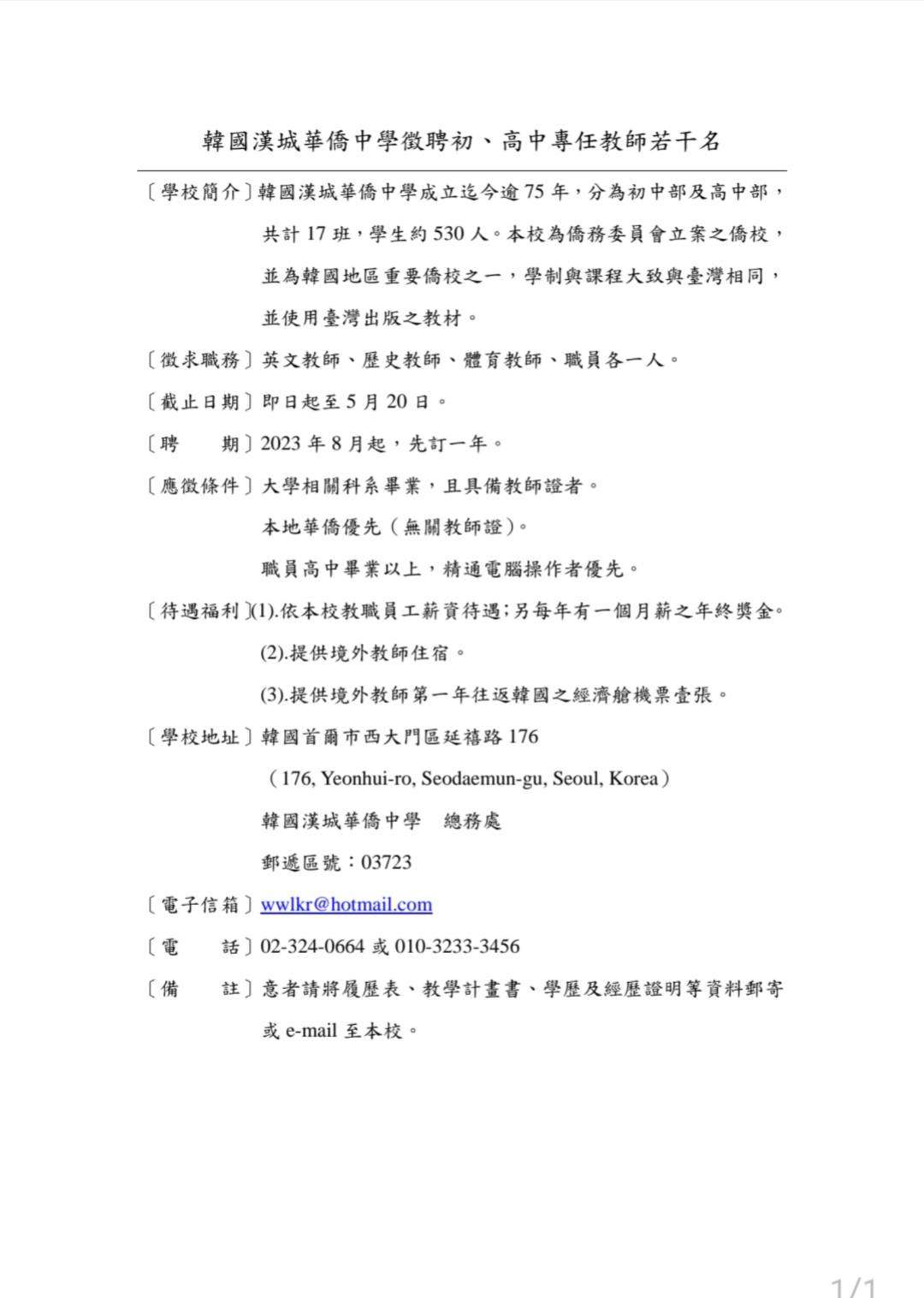 漢城華僑中學擬招聘教師及職員若干名,其條件及待遇等資料詳徵才訊息(如附件);有意應徵者請於112年5月20 日前將初審資料備齊後,逕電郵或郵寄至該校。