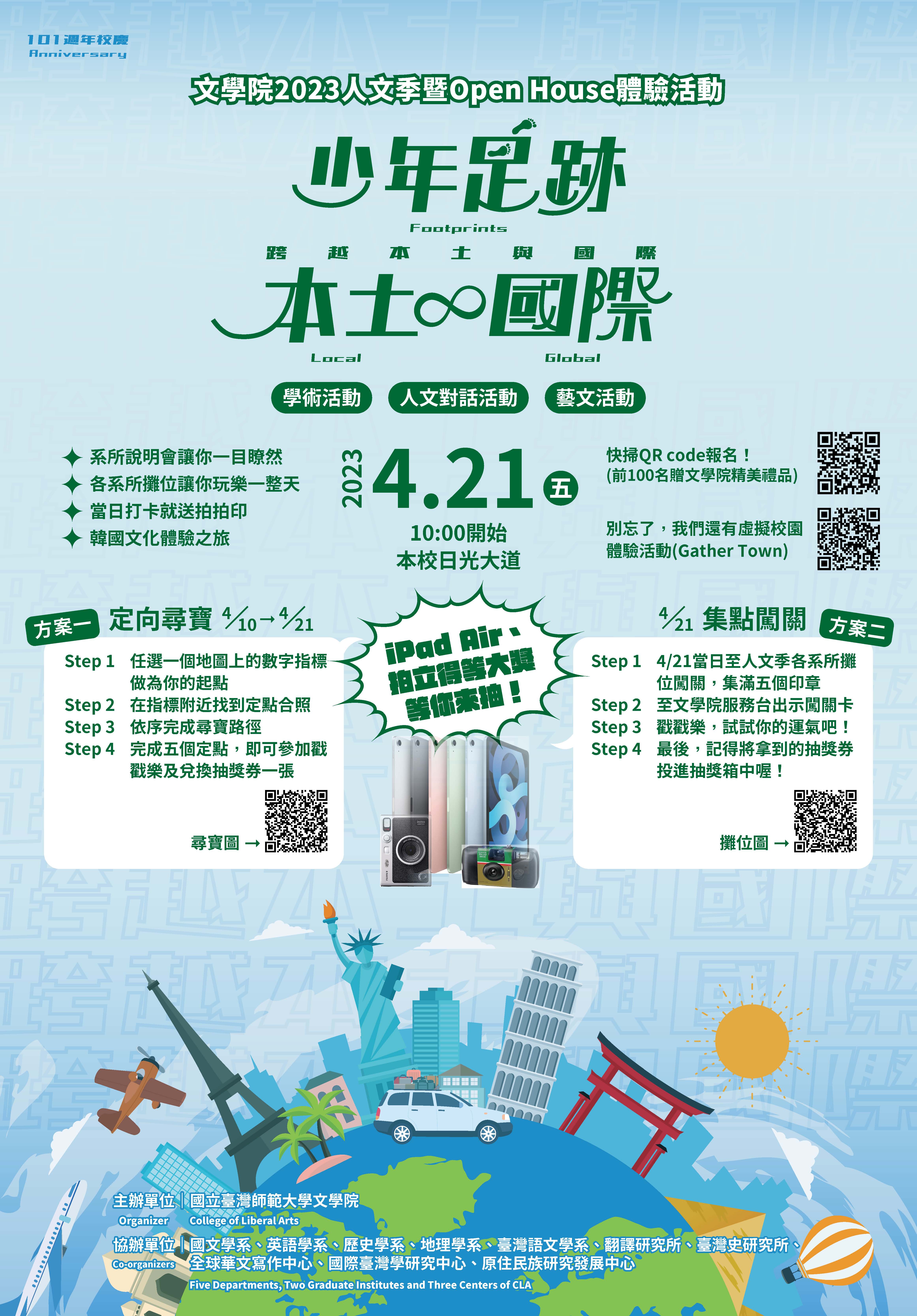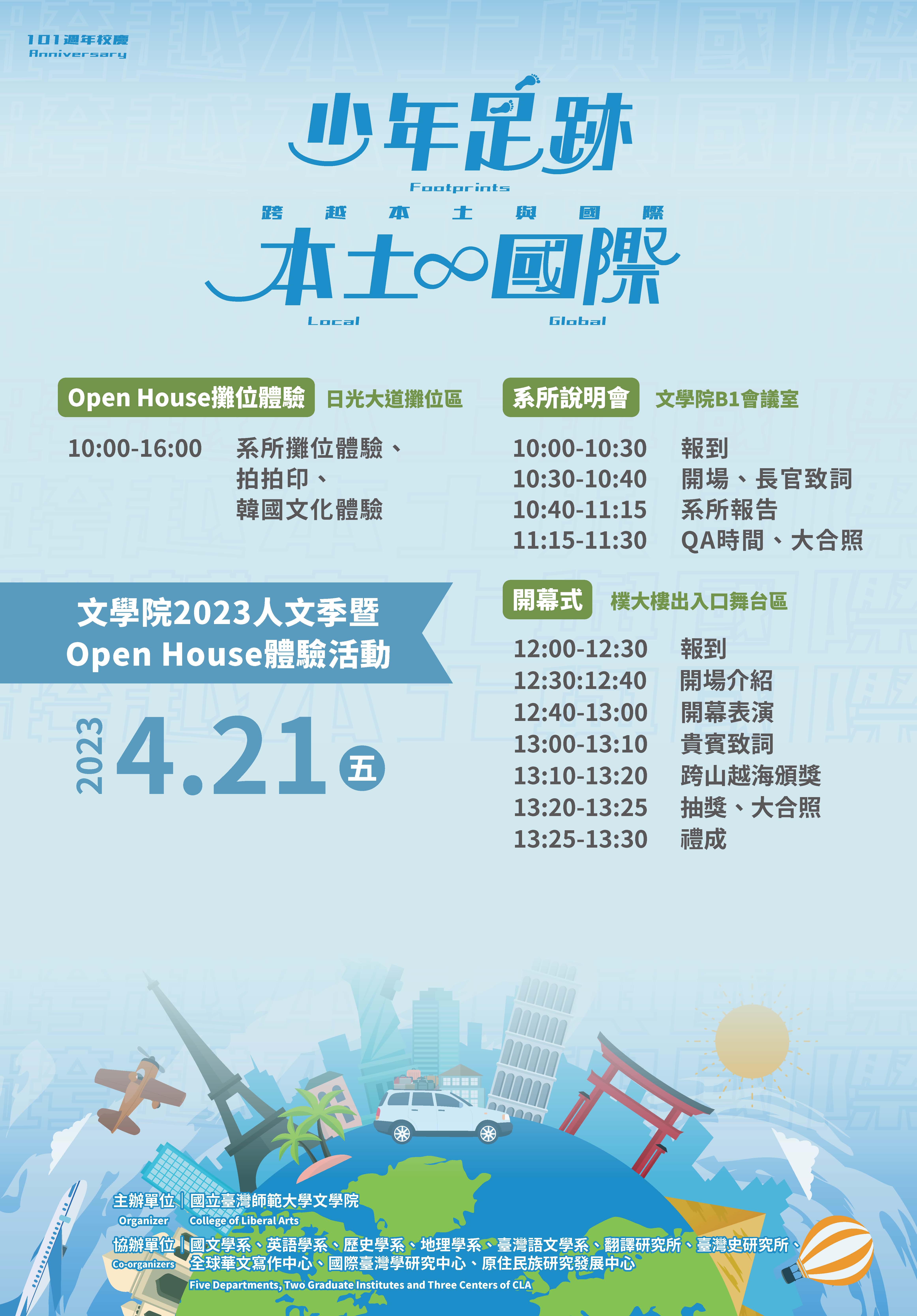 一、旨揭活動將以「Open House實體攤位體驗」與「Gather Town虛擬校園體驗」等兩種方式進行,由文學院所屬7個系所(國文學系、英語學系、歷史學系、地理學系、臺灣語文學系、翻譯研究所、臺灣史研究所)及5個學分學程(日本語文學分學程、韓國學與語文學分學程、哲學學分學程、原住民族教育文化學分學程以及數位人文與藝術學分學程)分別設置攤位進行系所簡介及互動。