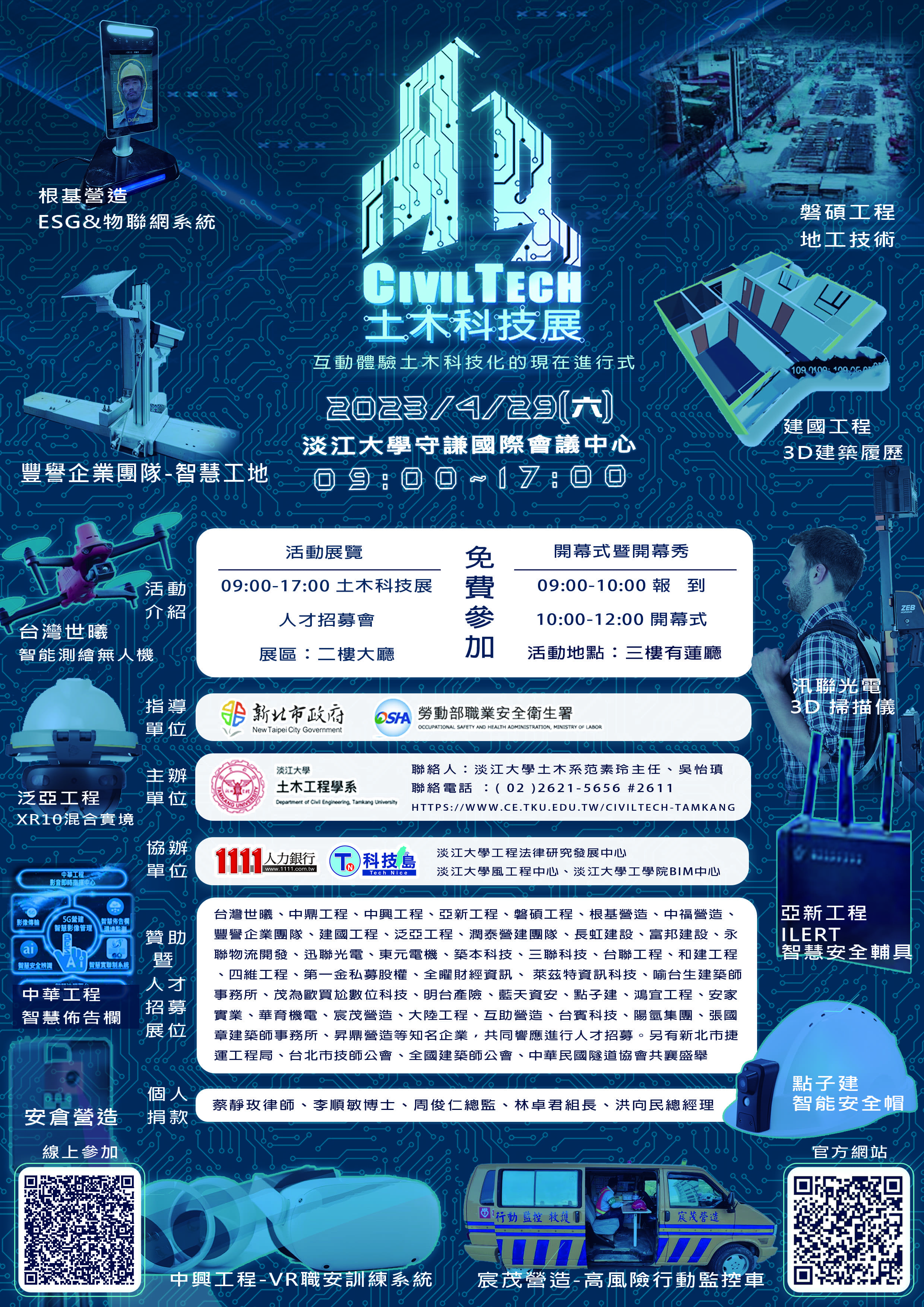 一、旨揭科技展於淡江大學淡水校園舉辦,係為使社會大眾能更正確認識土木產業,藉由本次展覽將介紹土木與現今AI、AR /VR及IoT等技術結合,翻轉以往民眾對於土木產業的刻板印象,並邀集土木工程相關產業,結合科技技術與應用之廠商、公會或協會參展。