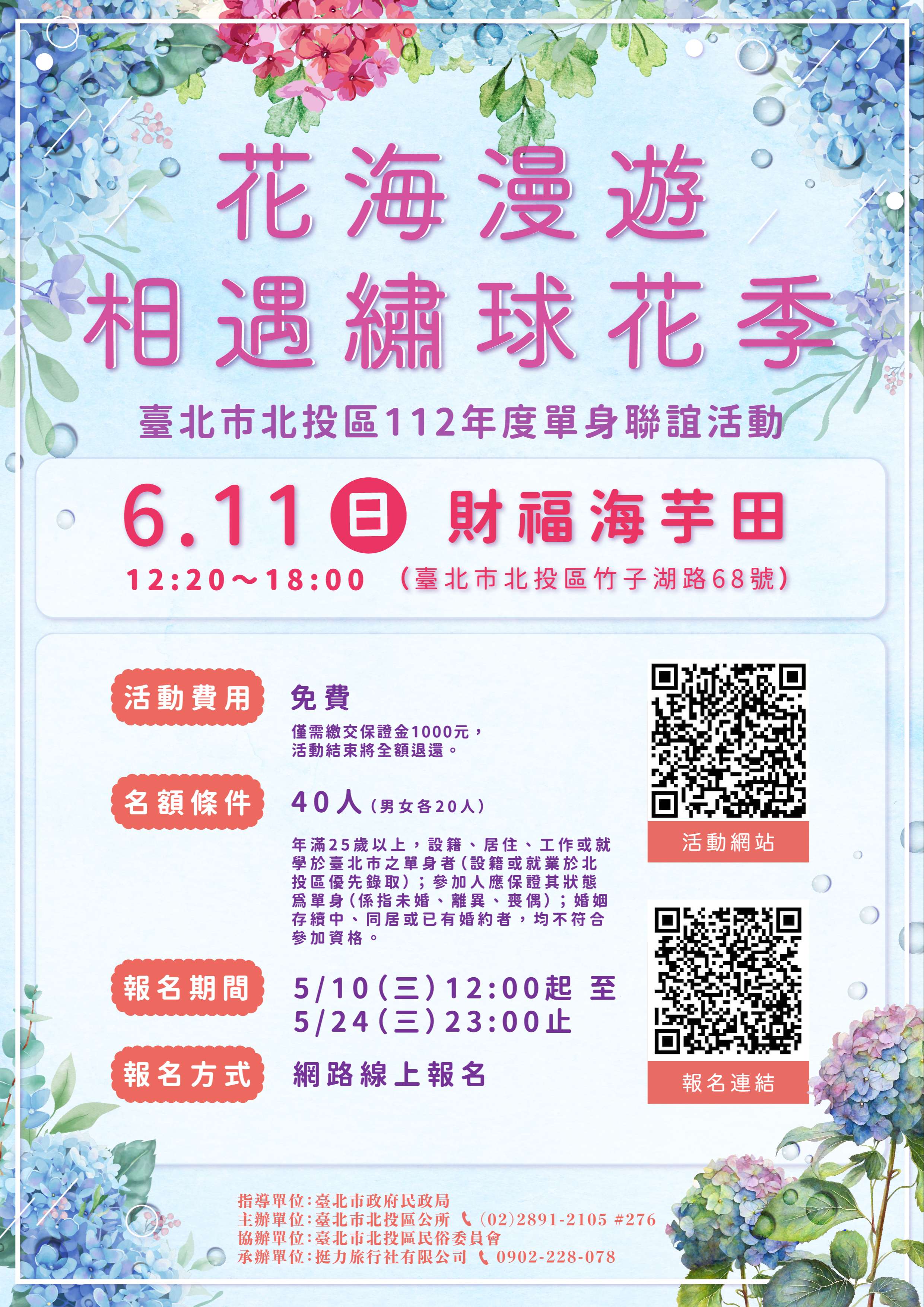 為臺北市北投區公所辦理112年度「花海漫遊—相遇繡球花季」單身聯誼活動,請惠予協助宣傳並鼓勵單身同仁參加,請查照。