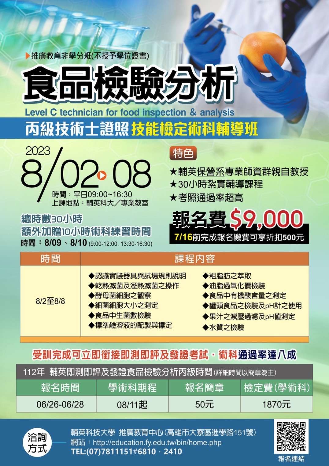 一、輔英科技大學推廣教育中心開設「食品檢驗分析丙級技術士證照技能檢定術科輔導班」,除輔導學生考取食品檢驗與分析丙級技術士證照外,亦可
