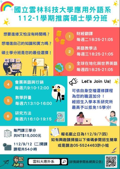 檢送國立雲林科技大學應用外語系推廣碩士學分班招生訊息,即日起開放報名,敬請惠予公告並鼓勵所屬人員報名參加,請查 照