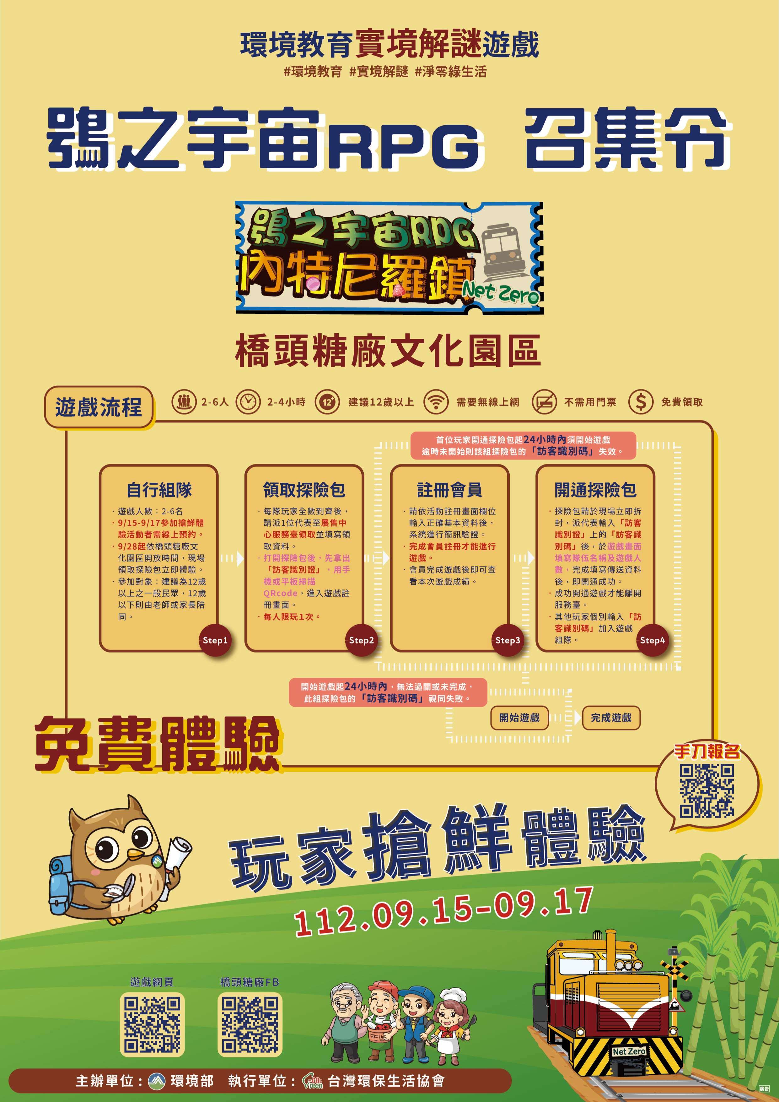 一、為鼓勵民眾走出戶外,實際至環境教育特色場域認識環 境,爰辦理本活動;以實境解謎遊戲,結合高雄橋頭糖廠 文化園區(高雄市橋頭區球場路3號)之環境教育設施場所 資源,並扣合「淨零綠生活」政策,設計出6個主題關卡之 「鴞之宇宙RPG-內特尼羅(Net Zero)鎮」遊戲(含2個 線上主題關卡),讓民眾在實境解謎過程中學習綠生活知 識,進而珍惜地球資源,落實保護環境行動,達成淨零綠 生活目標。