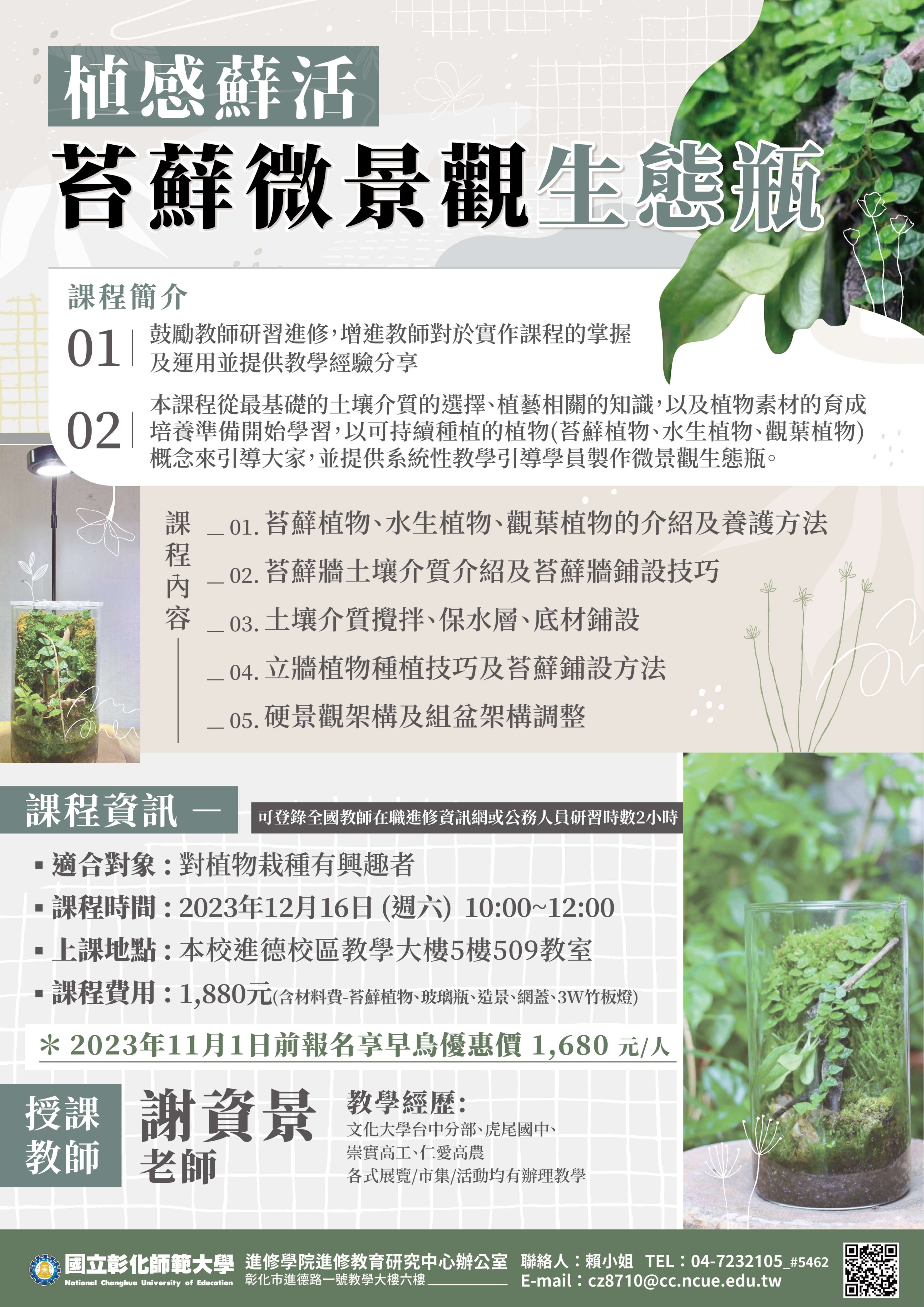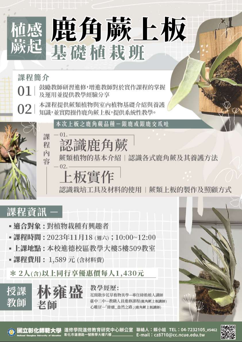 檢送國立彰化師範大學進修學院推廣教育課程「【植感蕨起】鹿角蕨上板基礎植栽班」、「【植感蘚活】苔蘚微景觀生態瓶」課程簡章共兩門,敬請惠予公告,請查照。