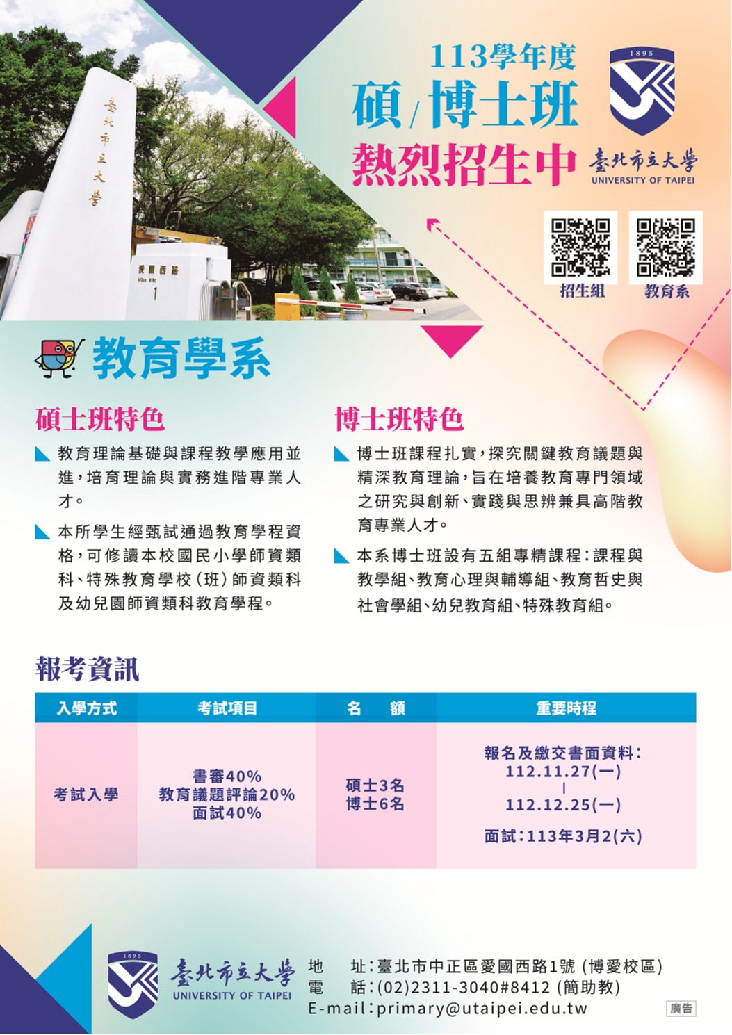 檢送臺北市立大學教育學系「113學年度碩士班暨博士班考試入學」招生海報1份,歡迎教師踴躍報考。