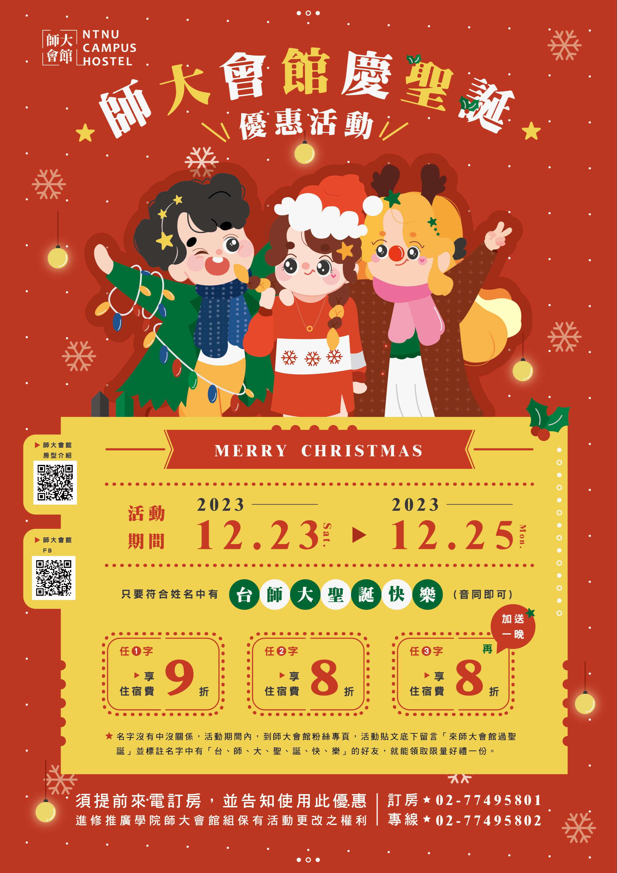 國立臺灣師範大學師大會館推出「師大會館慶聖誕」」住宿優惠方案, 歡迎大家宣傳。