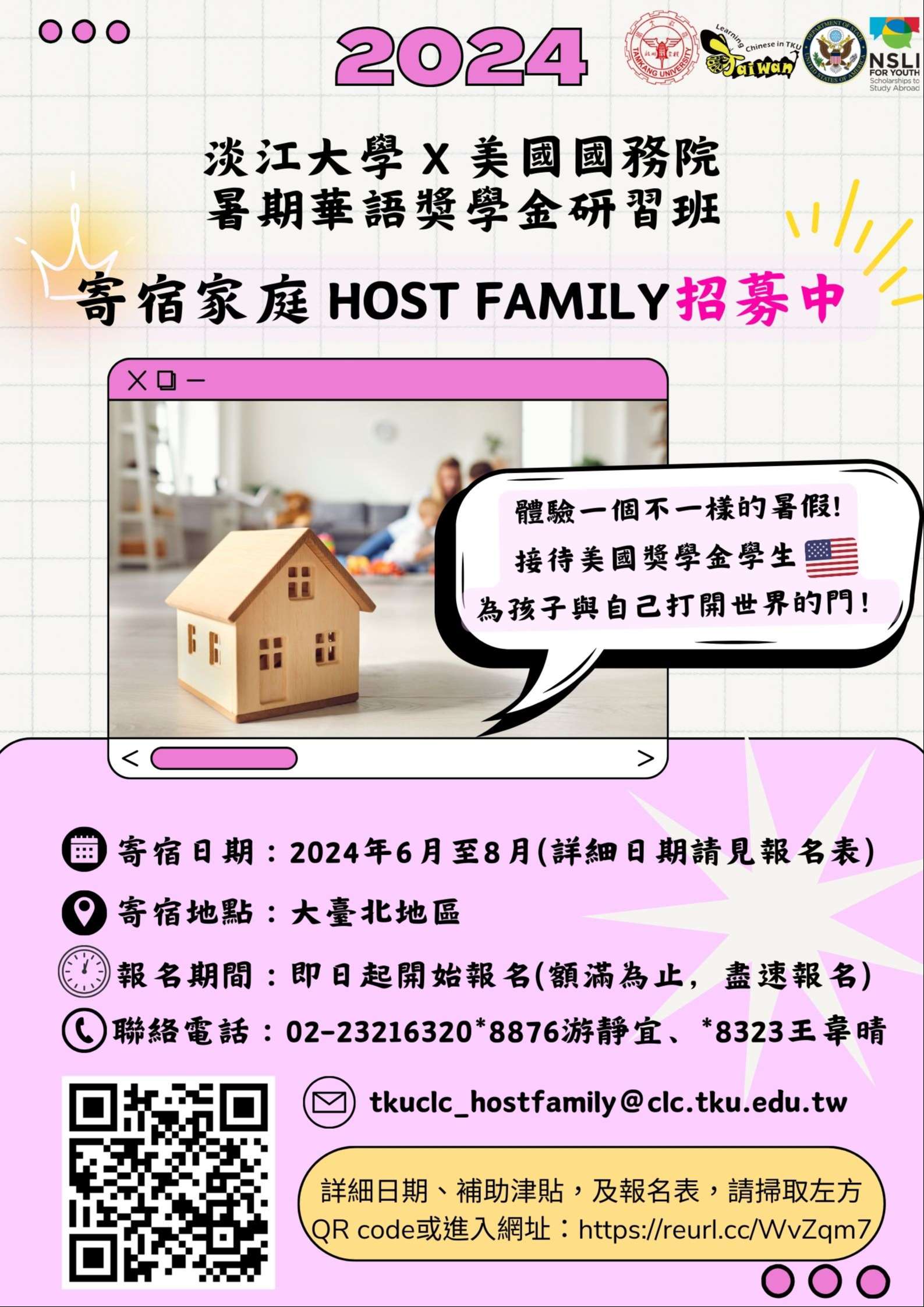 淡江大學推廣教育處華語中心承辦2024年暑期「美國國務院華語獎學金研習班」徵選臺灣寄宿家庭,歡迎踴躍報名!
