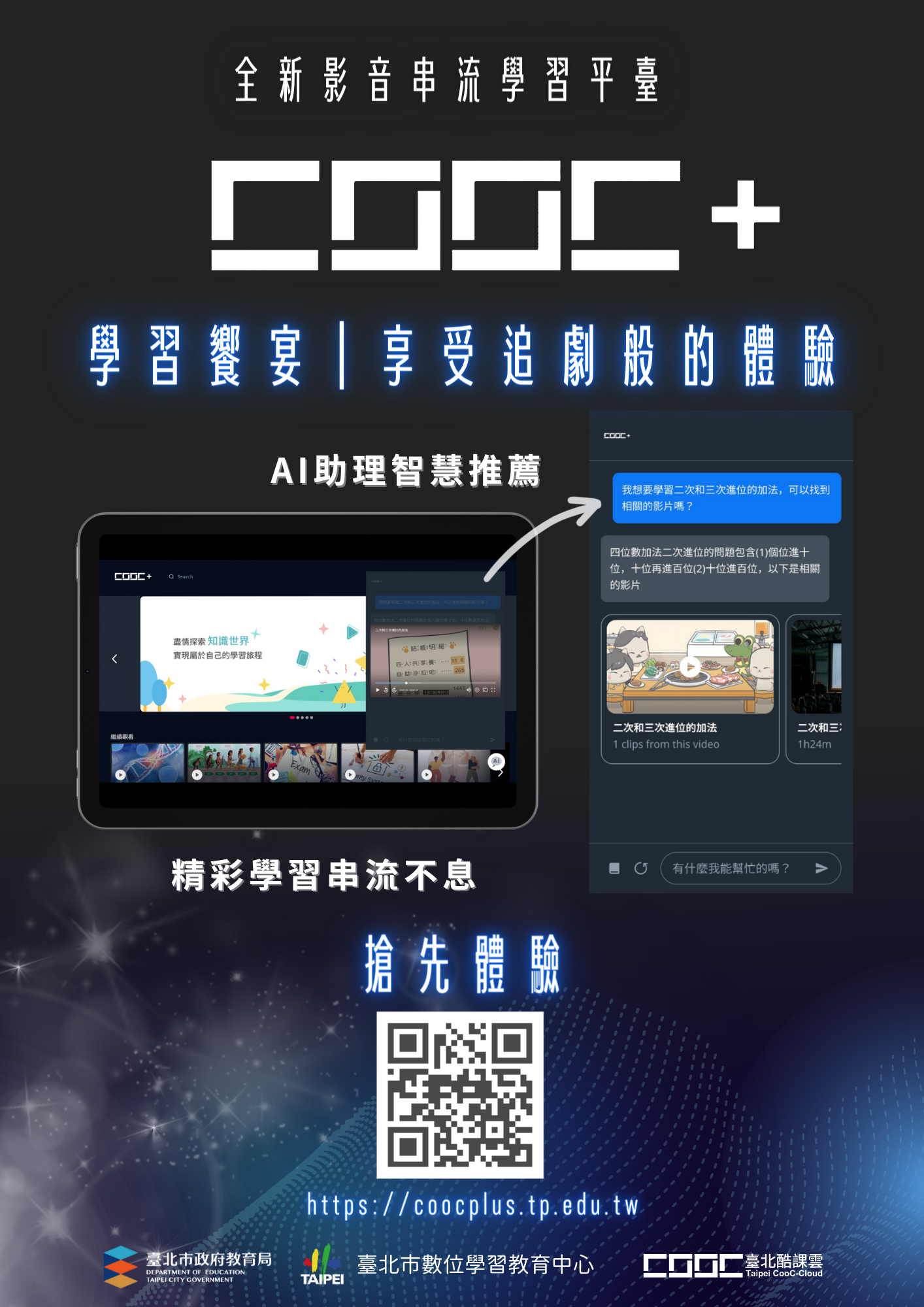 一、臺北酷課雲全新推出「CooC+影音串流學習平臺」,打造直覺友善的操作介面,以劇集分類收錄上千支優質動畫學科影片。結合AI助理智慧推播功能,可依據學生使用習慣及學習進度給予個人化推薦,提供學生更好的線上自主學習體驗。