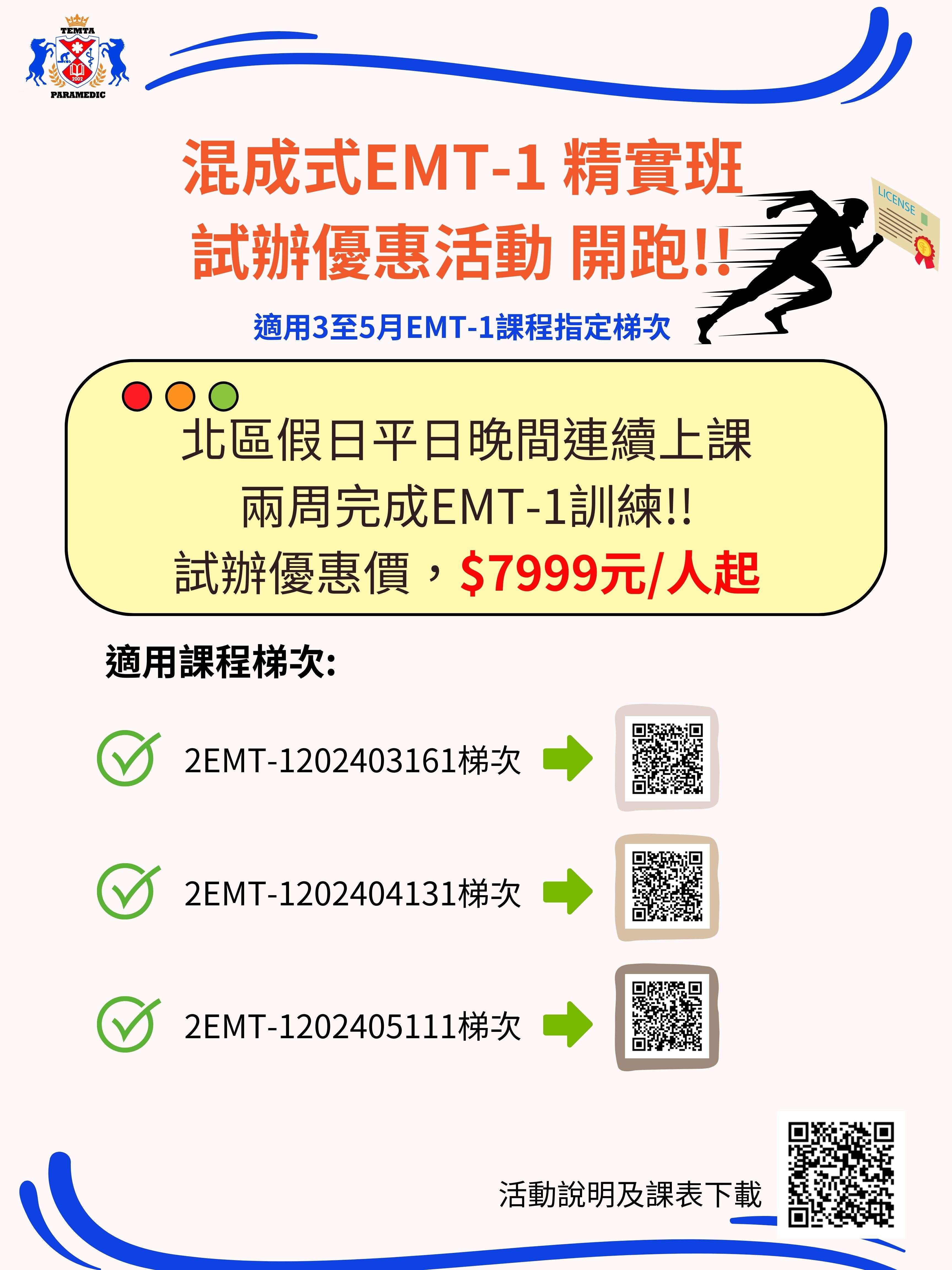 一、即日起,報名本會混成式EMT-1訓練課程精實班,即享試辦 優惠價每人$7999元,懇請 貴校協助轉發本會優惠課程之 海報宣傳周知(附件1)。