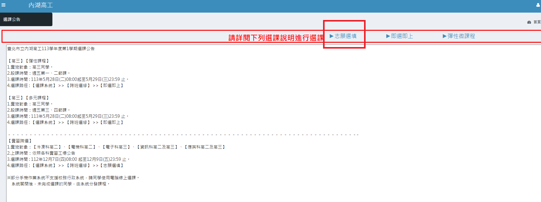 部分手機作業系統不支援校務行政系統,請同學盡量使用電腦線上選課。系統關閉後,未完成選課的同學,由系統分發課程。