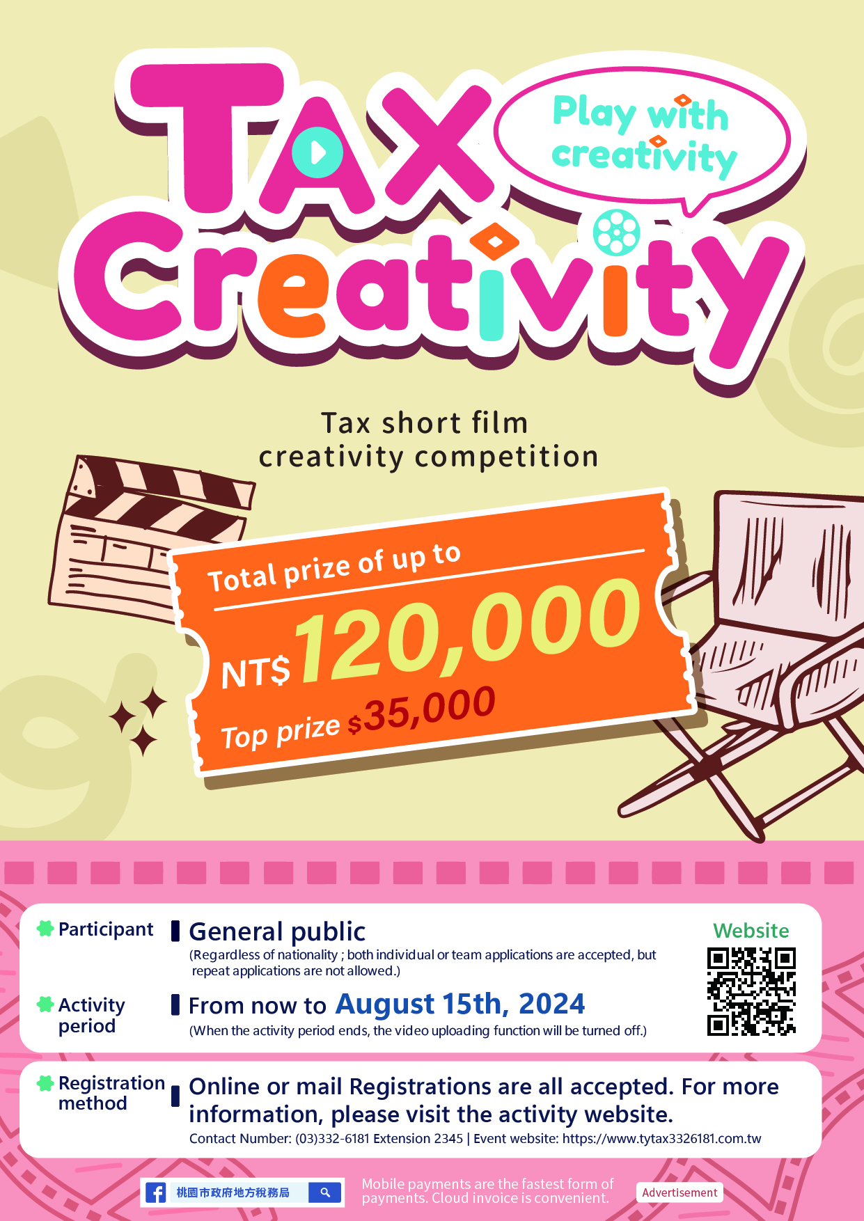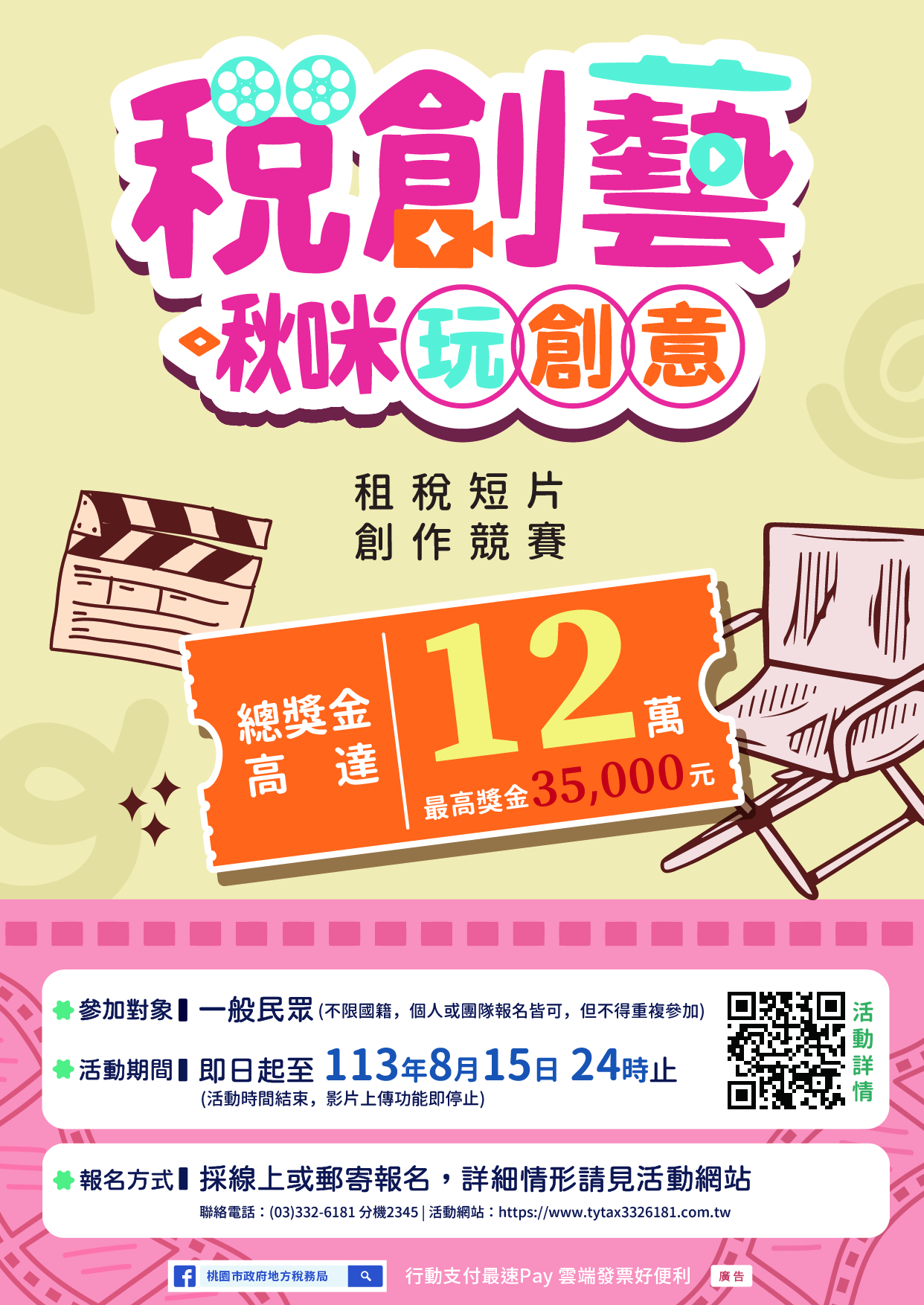2、參賽作品時間以1至3分鐘為限(含片頭及片尾),畫面要有「作品主題名稱」、「旁白字幕(繁體中文)」,並請於片頭加入「桃園市政府地方稅務局113年結合統一發票推行辦理「稅創藝 啾咪玩創意」租稅短片創作競賽」字樣,並於片尾加註「廣告」。