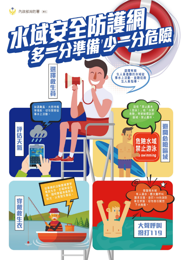 二、考量現值夏季炎熱時節,民眾常至溪邊海邊等水域地區戲水玩樂,消除暑氣。為提醒民眾做好防溺措施,避免溺水造成生命的損害,113年8月份以「防溺」為防災宣導主題,彙整宣導影片2部、圖片2張、動畫1則、及跑馬燈文字1份,推動防災意識及觀念,增進市民安全。