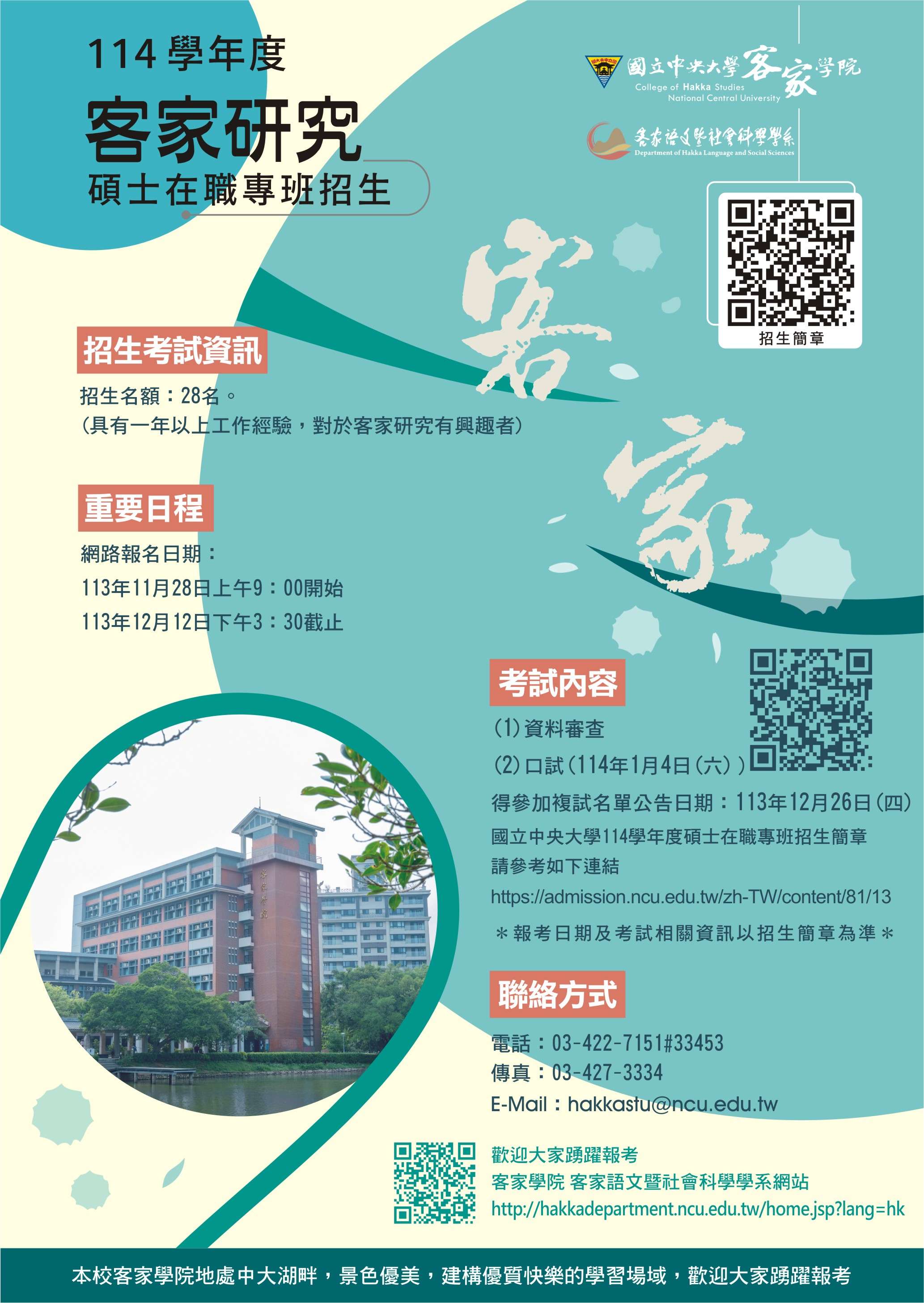 一、本校客家語文暨社會科學學系「客家研究碩士在職專班」 114學年度招生,考試內容為:資料審查(免筆試)及口 試,招生海報如附件。